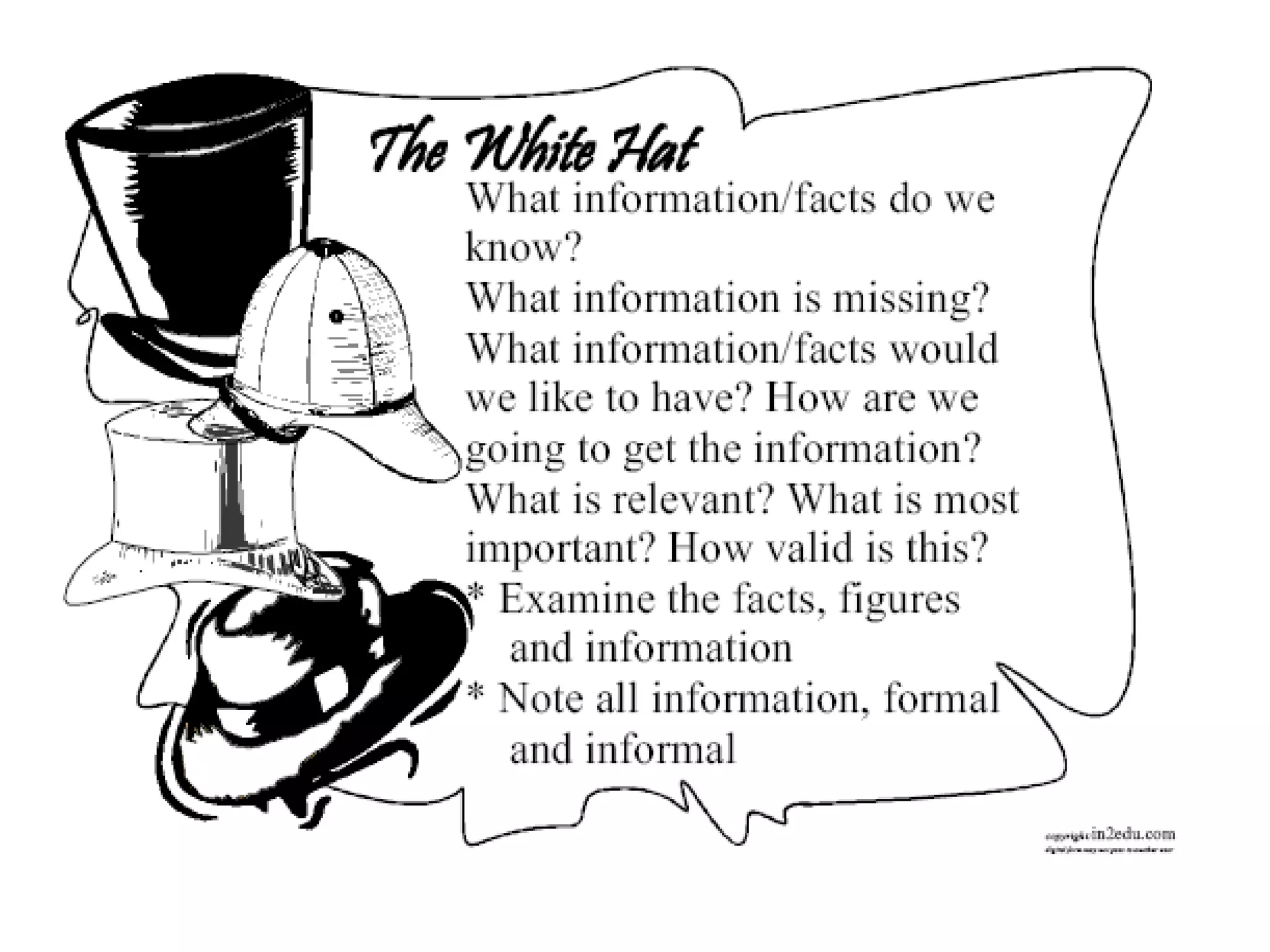 Caution Sequence Lookingcritically at situations. You are first considering facts with the white hat . Then use the black hat to discover difficulties. This can be followed up with some blue hat or red hat thinking. Examples: consider the consequences Throwing most of your lunch in the bin everyday. Not letting someone know where you are going.
