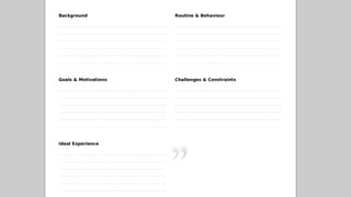 This document provides guidance for developing concepts for the Vichealth Innovation Challenge on alcohol. It discusses starting with identifying why the problem is important and the current situation's impact. It also covers getting to know the target audience, identifying the problem being solved, prototyping and testing ideas, and developing personas. Assumptions should be tested through methods like landing pages, blog posts, emails, surveys, and prototypes to gather feedback from the target audience.