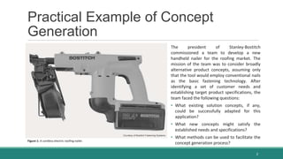 The document outlines a structured approach for concept generation in product development, utilizing a practical example of a new handheld nailer for the roofing market. It emphasizes the importance of exploring customer needs, decomposing complex problems into simpler sub-problems, and employing both external and internal searches for solutions. Key methodologies such as brainstorming, classification trees, and concept combination tables are highlighted to enhance creativity and systematically navigate the solution space.