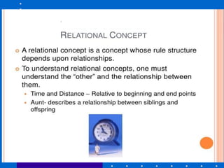 The document discusses the concept of mental grouping, where concepts help categorize and understand objects, events, and people based on shared attributes. It elaborates on types of concepts such as disjunctive, conjunctive, and relational concepts and their definitions, offering examples to illustrate these types. Additionally, it outlines steps for concept formation and promotes effective strategies for learning and evaluation.