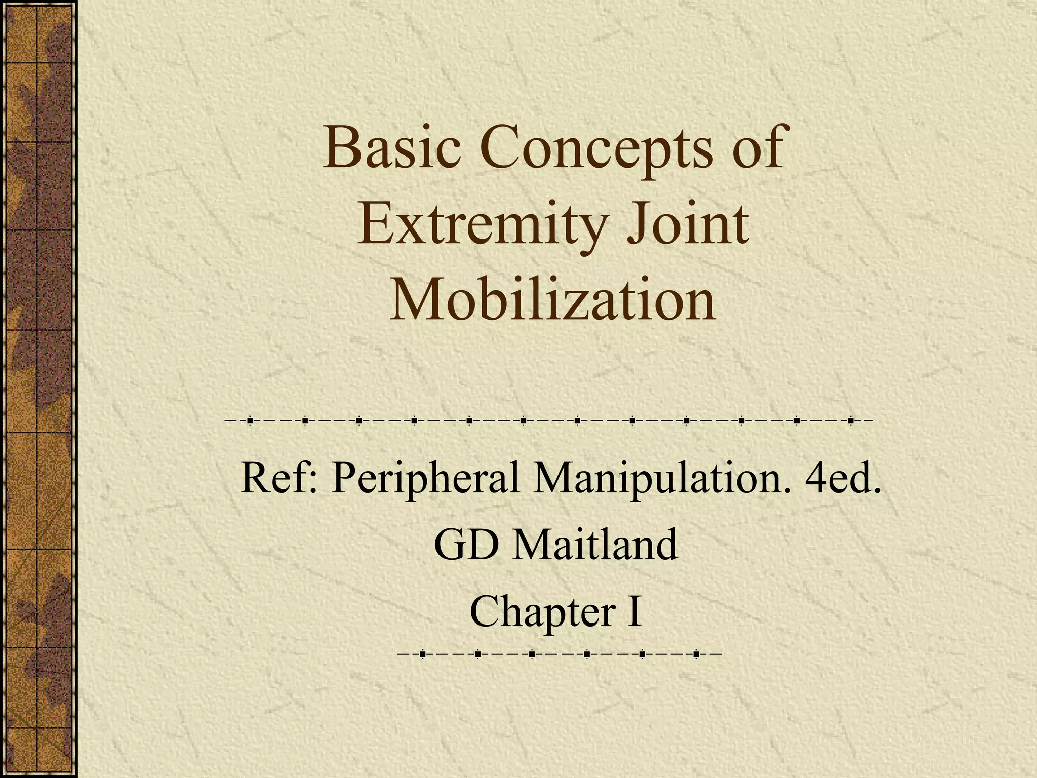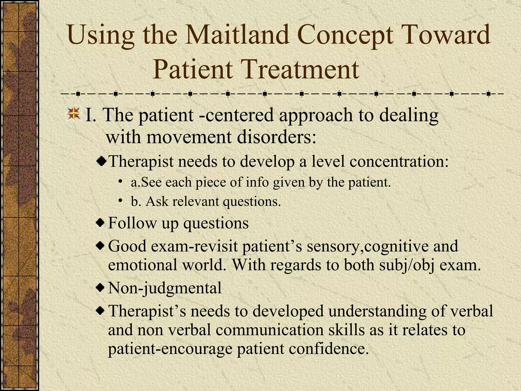 The document discusses Maitland's concept of using a "brick wall" approach to separate clinical evidence and theoretical thinking when treating patients. There are five requirements for this approach: 1) Think in two compartments of clinical and theoretical, 2) Prioritize the clinical compartment over theoretical, 3) Choose careful wording to separate theory from clinical findings, 4) Choose treatment techniques based on patient signs and symptoms rather than theory, 5) Apply the brick wall concept to clinical decision making. The two compartment approach allows speculation based on research but it must be consistent with the patient's clinical presentation.