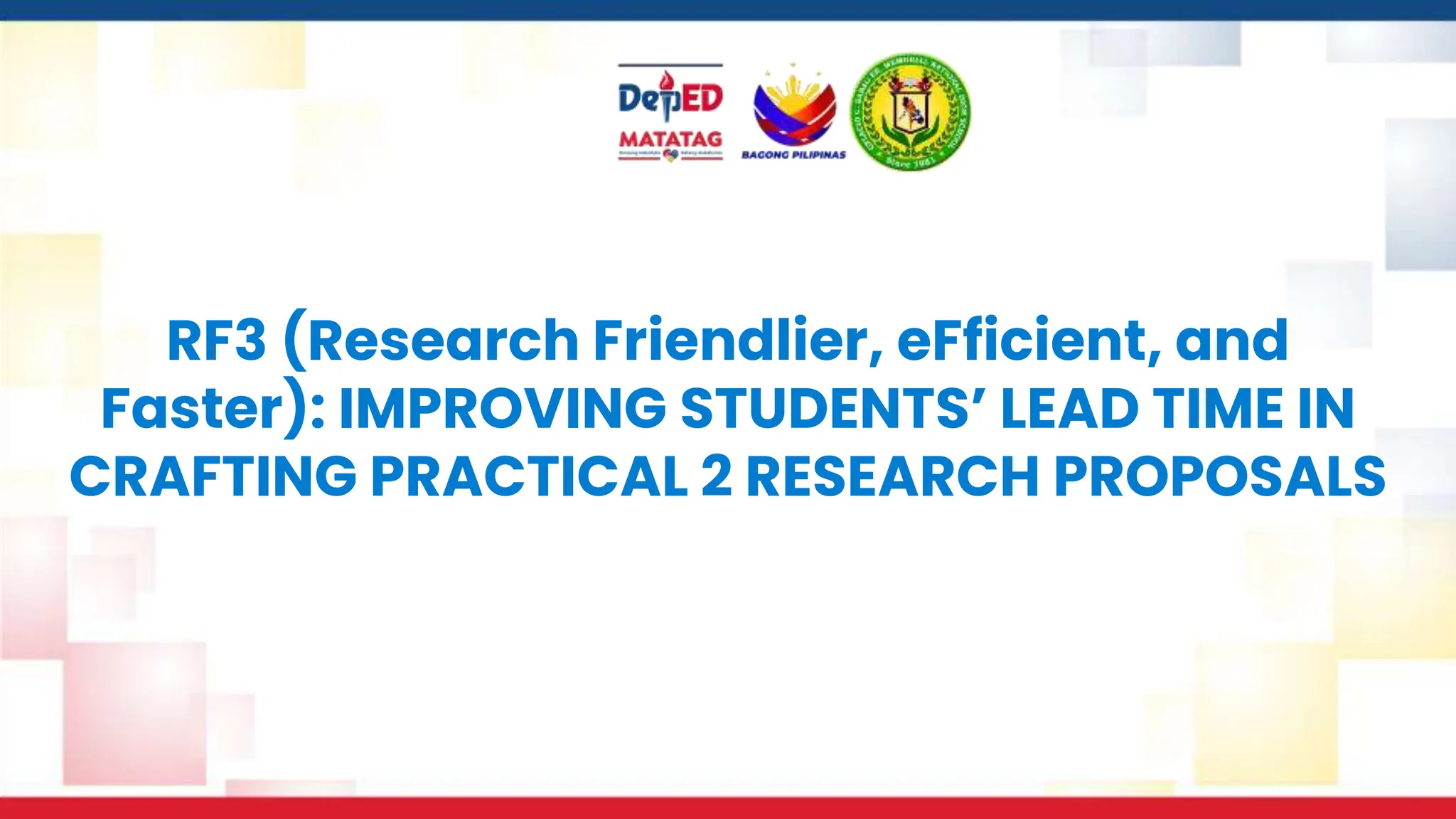This document proposes a new system called RF3 to improve students' research proposal process at Gelacio C. Babao Sr. MNHS. Currently, students struggle to complete proposals on time, with most finishing 2-4 weeks late. RF3 aims to create a faster lead time by implementing a technology-based process integrating essential parts of proposals, and a database with monitoring. The conceptual framework explains how RF3 would provide a solution. Related studies found factors causing undergraduate students difficulties in writing proposals. The research questions ask how effective RF3 will be by comparing current and new lead times before and after implementation.
