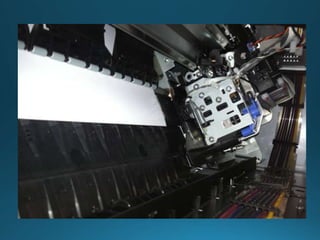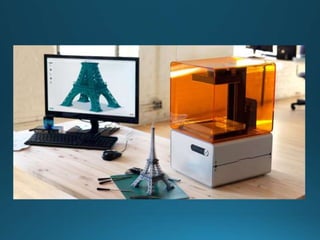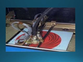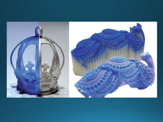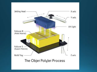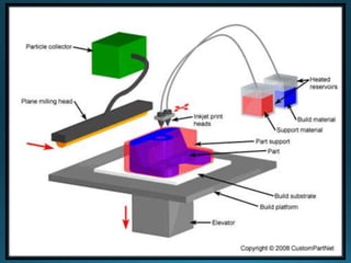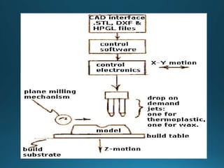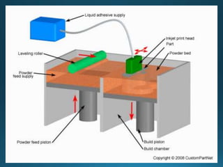 The document discusses several common ink jet printing techniques for additive manufacturing, including the Sanders Model Maker, Multi-Jet Modelling, Z402 Ink Jet System, and Genisys Xs printer. It describes the key components and processes of these systems, such as using ink jets to deposit liquid materials layer by layer, and how they are used to quickly produce prototypes and models.