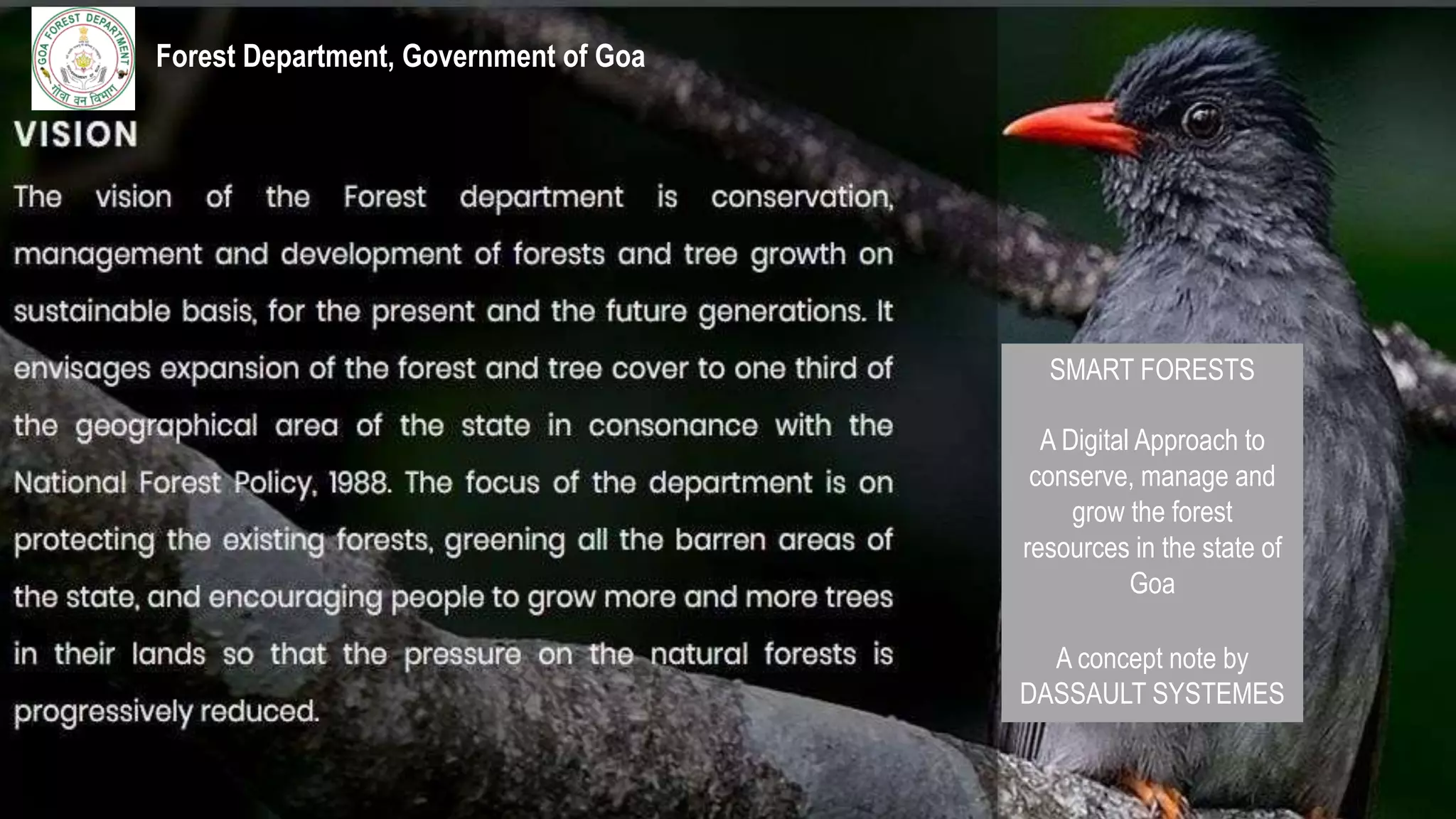The document outlines a digital approach by Dassault Systèmes to conserve and manage forest resources in Goa through the creation of a 3D model of the forest zone, incorporating encroachment data and topography. It employs machine learning and AI with GIS data for predictive analysis in areas like plantation planning and deforestation tracking. The solution also includes integrated project management and dashboarding strategies for the forest department.