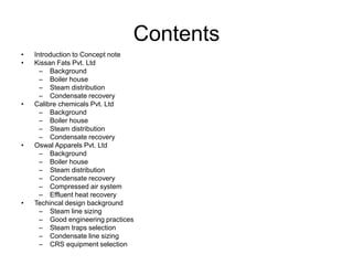 This document provides concept notes for designing utility distribution systems for three companies - Kissan Fats Pvt. Ltd, Calibre Chemicals Pvt. Ltd, and Oswal Apparels Pvt. Ltd. It discusses the background of each plant, proposed modifications to boiler houses, steam distribution, condensate recovery, and other relevant technical details. Key considerations covered include operability, maintenance, safety, energy efficiency, and accommodating future expansion. Technical aspects like line sizing, engineering best practices, and steam trap selection are also outlined.