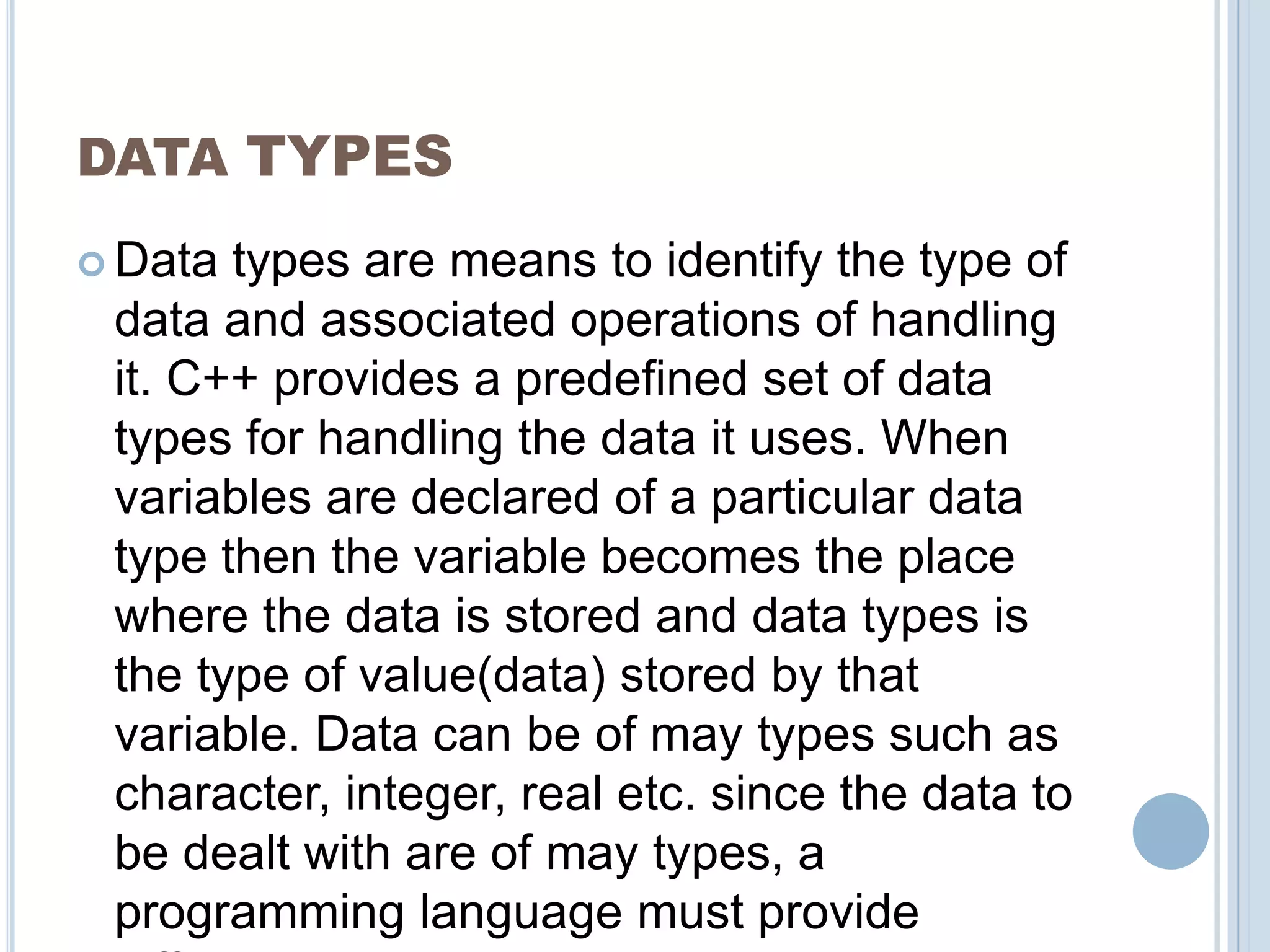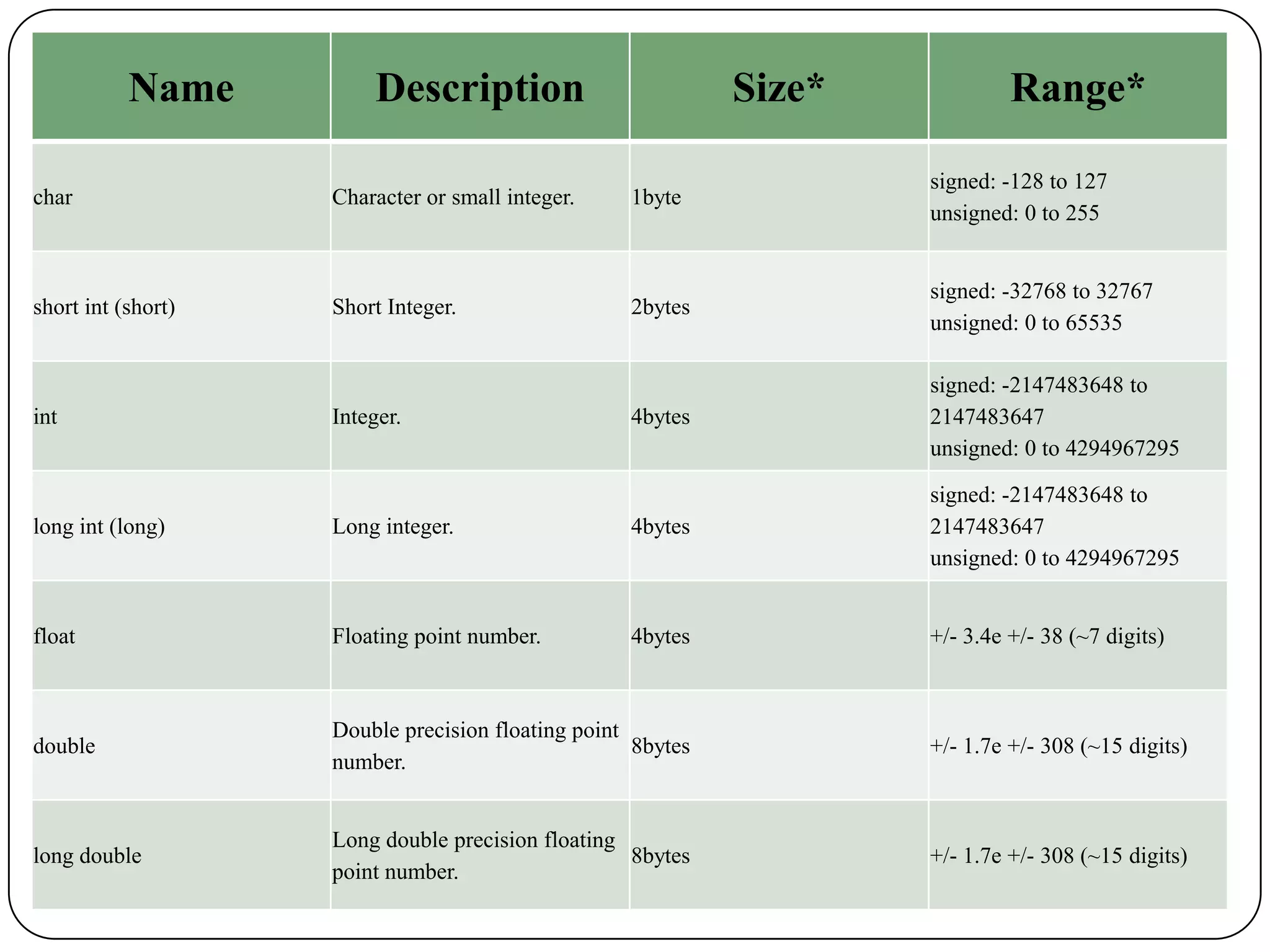 This document provides an overview of various C++ data types including fundamental, derived, and user-defined data types. It discusses integer, character, float, double, and void fundamental data types. It also covers integer, character, and floating-point type modifiers. Additionally, it summarizes arrays, functions, pointers, references, constants, classes, structures, unions, and enumerations as derived or user-defined data types in C++.