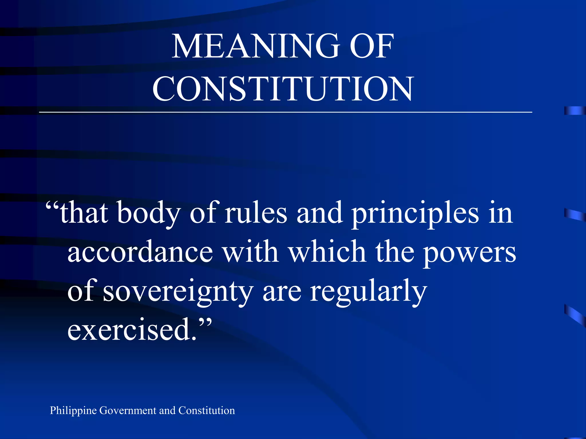 The document discusses key concepts related to constitutions and constitutional law. It defines a constitution as the rules that establish a government and the supreme law that other laws must conform to. The purpose of a constitution is to establish the permanent framework, assign powers and duties to departments of government, and set out basic founding principles. Constitutional law refers to both the law embodied in the constitution as well as principles developed through legal interpretation. The document also outlines essential parts and qualities of a good written constitution, including being broad, brief, and definite. It provides a brief overview of important constitutions in Philippine history.
