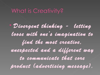 Divergent thinking allows one to find creative and unexpected ways to communicate an advertising message. Creativity can produce original ideas and join elements in new ways. In advertising, creativity means creative copywriting and graphic design that achieves the desired marketing objectives. The pyramid principle helps structure the creative process into three phases: gathering information, analyzing it, and allowing an idea to emerge from accumulated efforts. Creativity leads to big ideas that cannot be forced but must be nurtured.