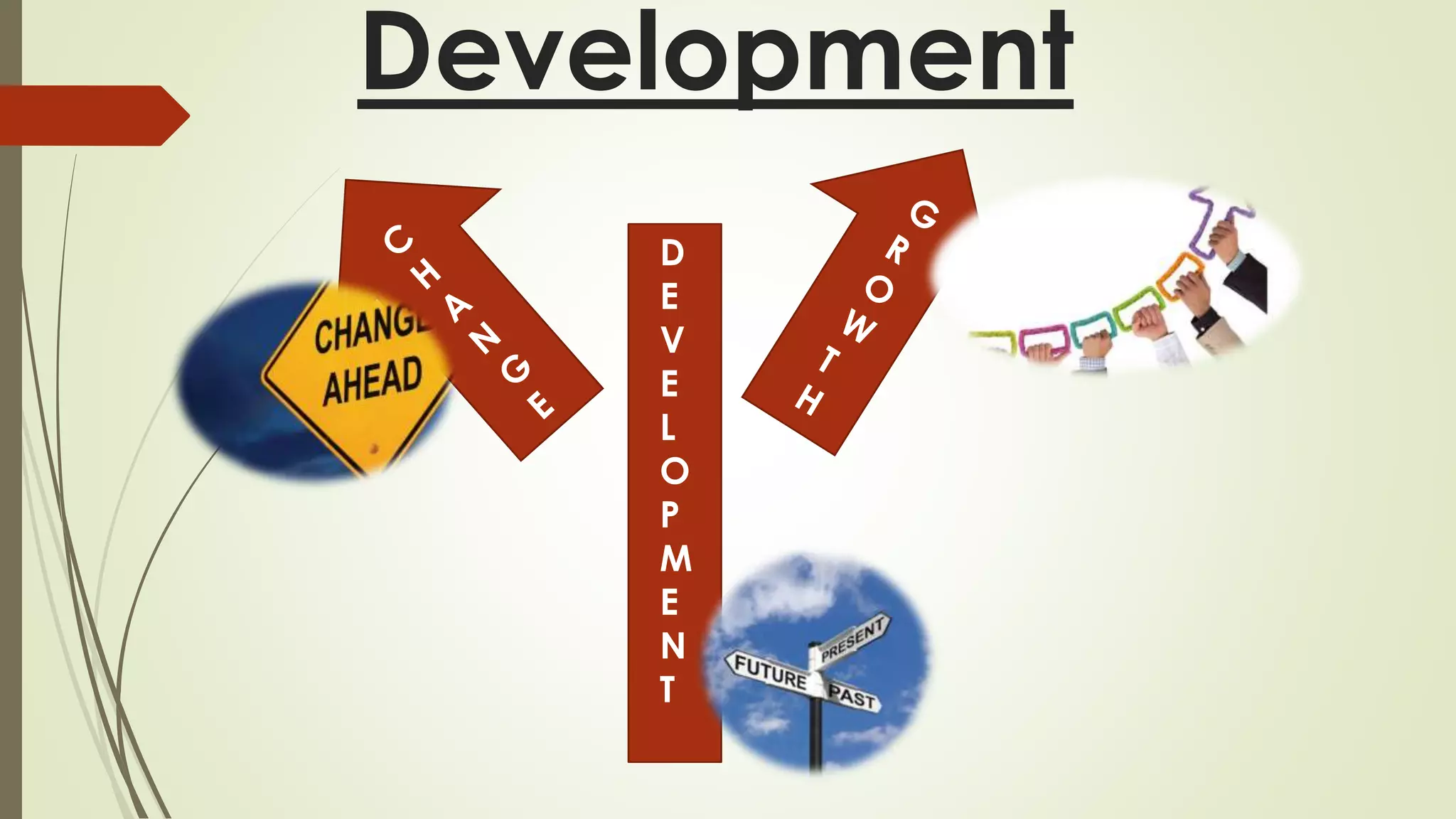 The document discusses the concept of development, highlighting its dual nature as both a natural process and an objective measure of progress. It differentiates between short-term growth, such as increased crop output from good rainfall, and long-term, comprehensive development, like improved crop yield via irrigation. Ultimately, development is presented as an all-encompassing idea that includes both qualitative and quantitative changes.