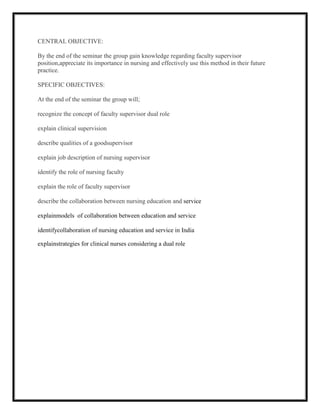 This document discusses the concept of a faculty supervisor position in nursing education which combines both teaching and clinical responsibilities. It provides an overview of the objectives and duties of a faculty supervisor, including recognizing the dual role concept, explaining clinical supervision, describing the qualities of a good supervisor, and identifying the roles of both nursing faculty and supervisors. The document also outlines the job description and requirements for nursing supervisors and faculty.