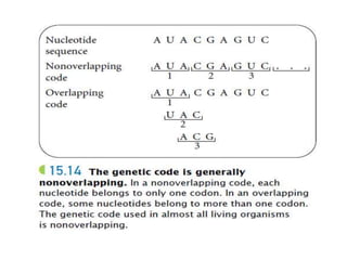 The document outlines the concept of the genetic code, emphasizing that codons, made of three nucleotides, are the basic units of this code, allowing for the encoding of amino acids. It describes properties of the genetic code, such as being degenerate, non-overlapping, comma-less, unambiguous, and nearly universal, as well as detailing the roles of initiation and stop codons. Additionally, the document covers the wobble hypothesis, which explains flexibility in base pairing at the third position of codons.