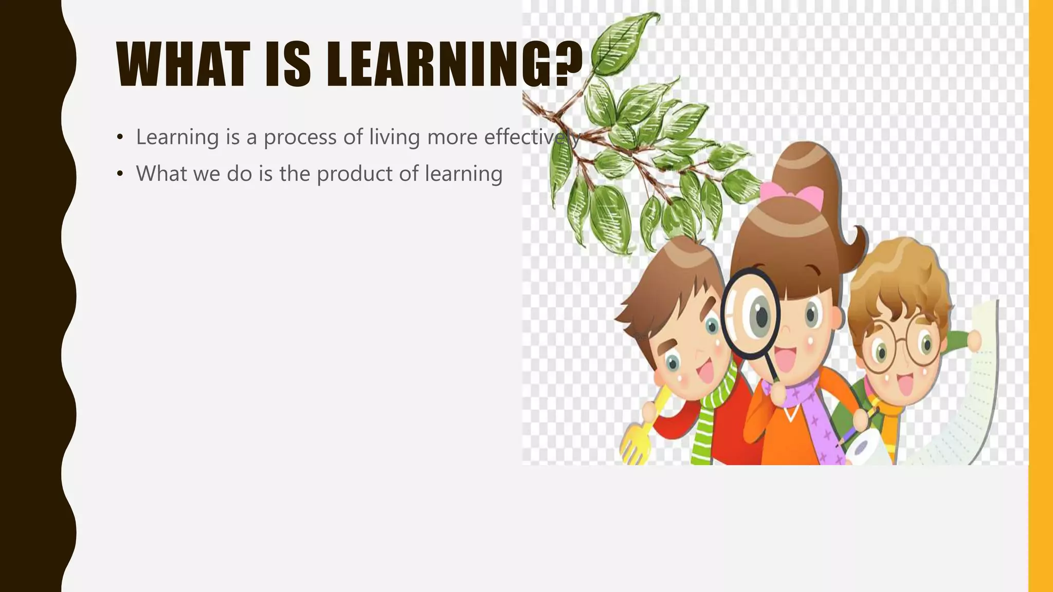 This document discusses learning and the factors that affect it. It defines learning as the modification of behavior through experience and training. Learning is a process, not a product, and it involves changes in an individual from birth through experiences and training. It can lead to positive or negative behavioral changes. Factors that influence learning include individual characteristics like health, intelligence, and motivation, as well as environmental factors like teaching methods, resources, and infrastructure. There are different types of learning like verbal, motor, and conceptual learning. The outcomes of learning are desirable behavioral changes and the achievement of teaching objectives.