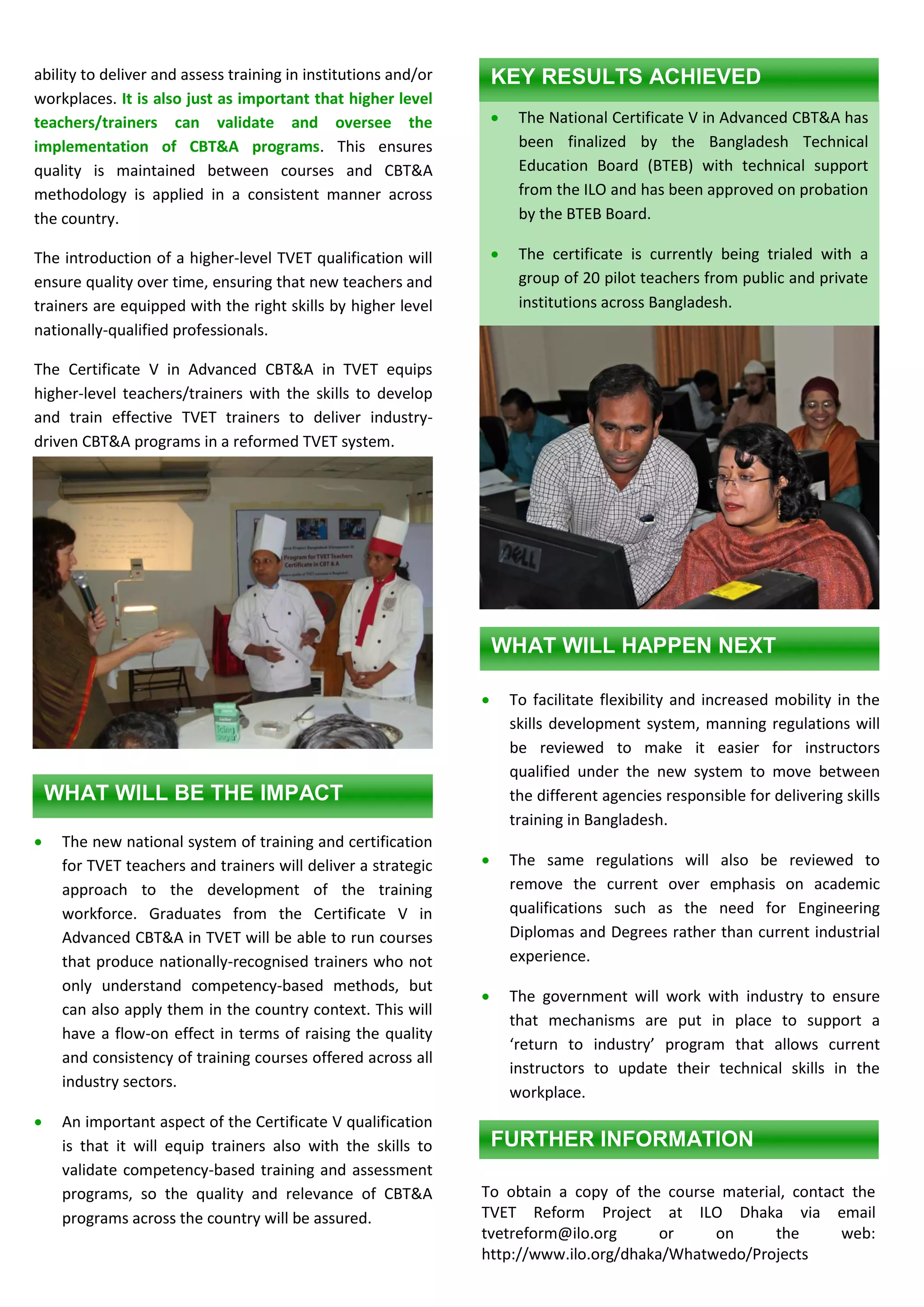 The National Certificate V in Advanced CBT&A in TVET is a competency-based qualification for TVET trainers and assessors in Bangladesh implemented with support from the ILO and EU. The 270-hour certificate provides training in competency-based training and assessment methods and is intended to improve the quality and consistency of TVET. A pilot with 20 teachers is currently being conducted, and the certificate aims to equip trainers to develop and evaluate industry-driven training programs according to national standards.