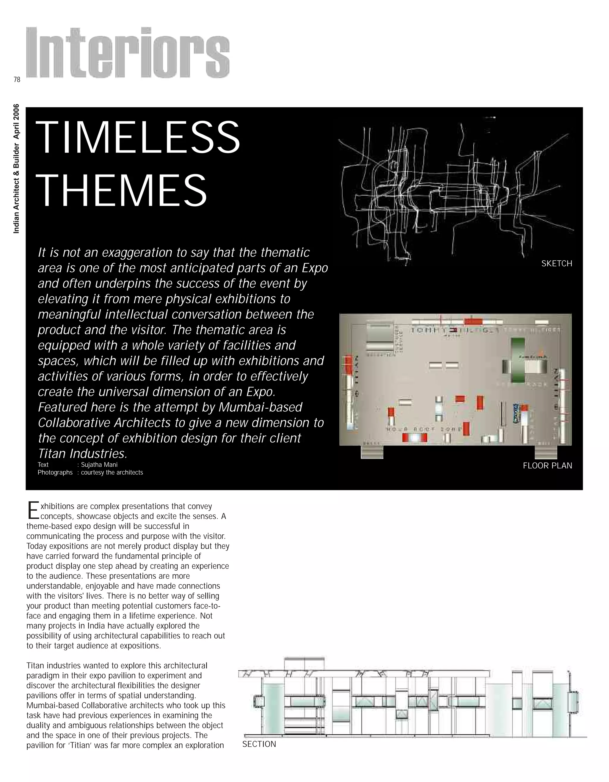 This document summarizes an exhibition pavilion designed by Collaborative Architects for Titan Industries. The pavilion's goal was to convey Titan's future directions while showcasing its brands. The architects created a narrative experience that unfolds over time zones, with modular displays configured to maximize visitor engagement. Key elements include an "Hour Roof Zone" depicting Titan's past, present and future, and flexible panel systems that can expand or contract based on space. The pavilion was designed to communicate Titan's message through architectural experience rather than a conventional art gallery approach.