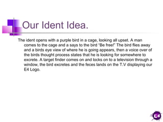 The proposed TV channel ident features a purple bird in a cage that is freed by a man. From a bird's eye view, the bird searches for a place to excrete and locks its target finder on a TV through a window, excreting on the TV and displaying the E4 logo. The ident fits E4's comedy-based brand because humor is achieved from the ident. Additionally, the use of the color purple for the bird matches E4's color scheme. The target 16-45 year old audience will understand the adult humor and find it amusing, encouraging continued viewing of E4 programming.