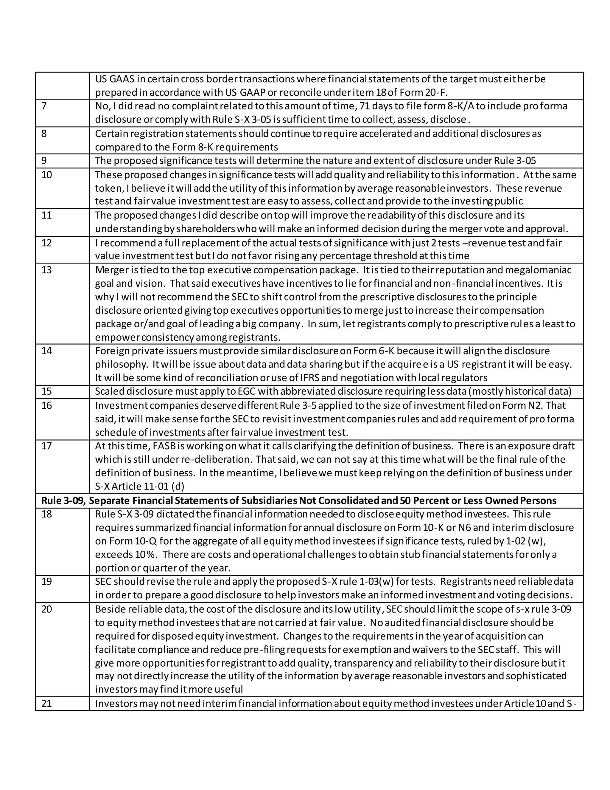 This document contains comments on proposed changes to SEC regulations regarding financial statement disclosures required for business acquisitions and other transactions. It discusses proposed modifications to significance tests used to determine disclosure requirements for acquired businesses, equity method investments, and collateralized securities. The commenter recommends replacing existing tests with simpler tests based on revenue and fair value to improve the reliability and understandability of disclosures for average investors. The commenter also provides feedback on changing requirements for pro forma financial statements, consolidated financial statements of guarantors, and scaled disclosures for smaller reporting companies.