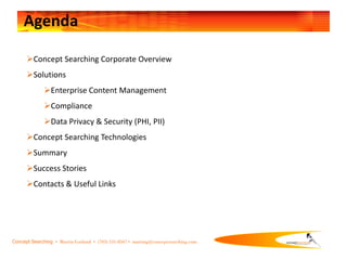 The document is an agenda for a presentation by Concept Searching Inc. It provides an overview of the company and its solutions for enterprise content management, compliance, and data privacy/security. It describes the company's technologies for automatic classification, taxonomy development and management within SharePoint. Success stories are presented from government, healthcare and other clients. Contact information is provided for the president and VP of marketing. Useful links to the company website and product information are listed.
