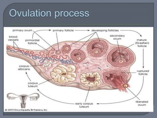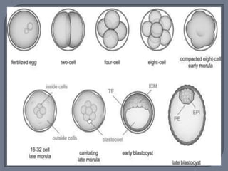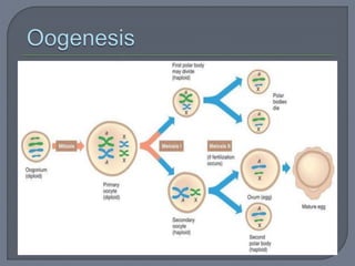The document summarizes conception and fertilization. It describes the maturation process of both male and female gametes. Spermatogenesis produces sperm from male germ cells, while oogenesis results in a mature ovum. Ovulation releases a secondary oocyte from the ovaries. Fertilization occurs when a sperm fuses with the ovum in the fallopian tubes, restoring the chromosome number and initiating embryonic development. This forms a zygote containing a mix of paternal and maternal genetic material.