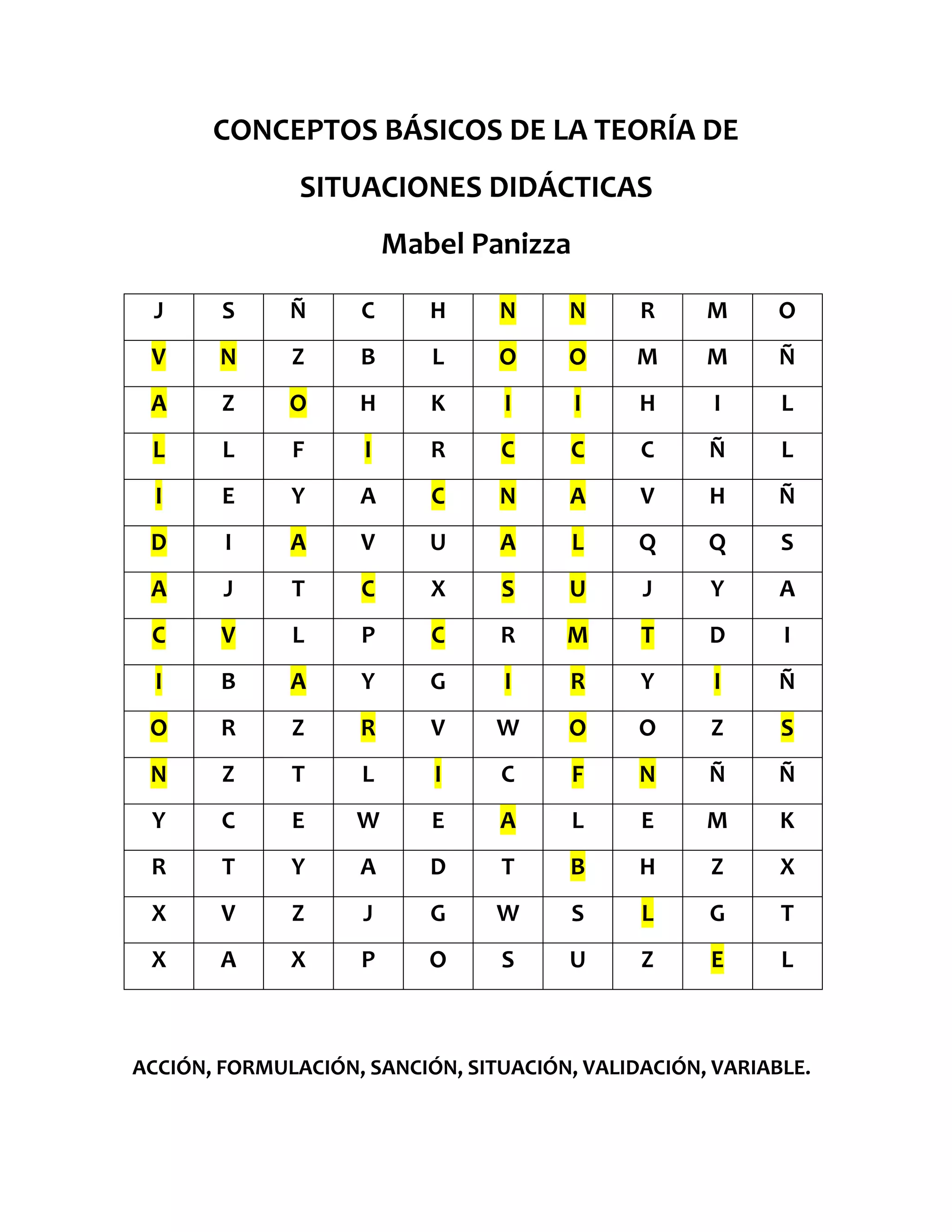 The document discusses the basic concepts of the theory of didactic situations, which analyzes the learning process through the interaction between the student and a problem or question presented by the teacher. The key concepts mentioned are action, formulation, validation, sanction, situation, and variable, which refer to the different steps and elements involved in setting up and resolving a didactic situation.