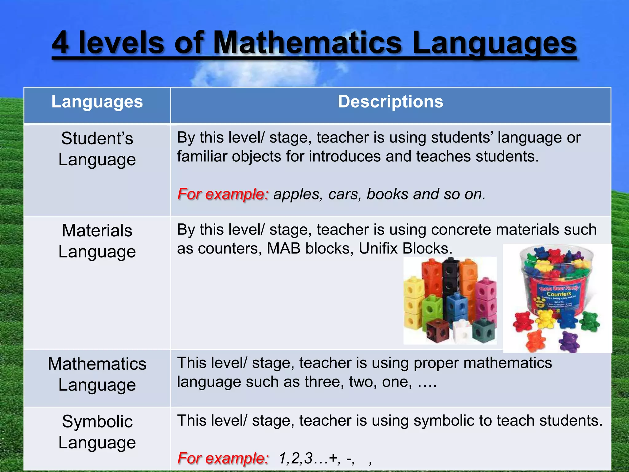1) The document discusses 4 levels of mathematics language used in teaching: students' language using familiar objects, materials language using concrete objects, mathematics language using proper terms, and symbolic language using symbols.