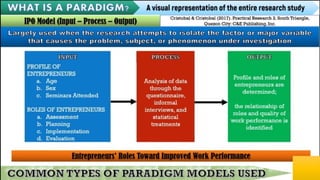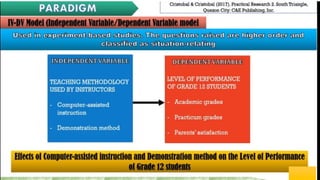 The document discusses a study examining the relationship between the number of hours studied (independent variable) and exam scores (dependent variable), moderated by IQ and mediated by the number of practice problems completed.