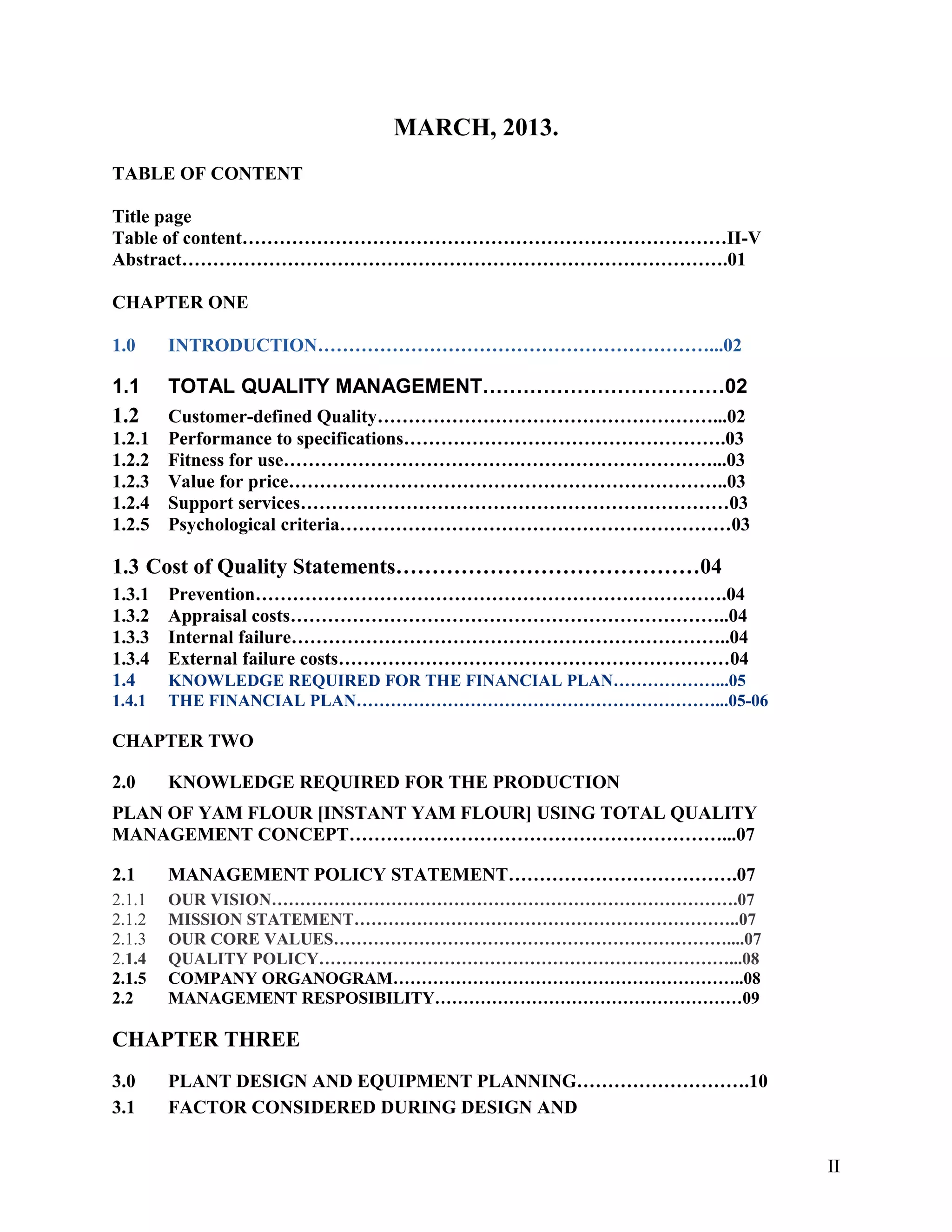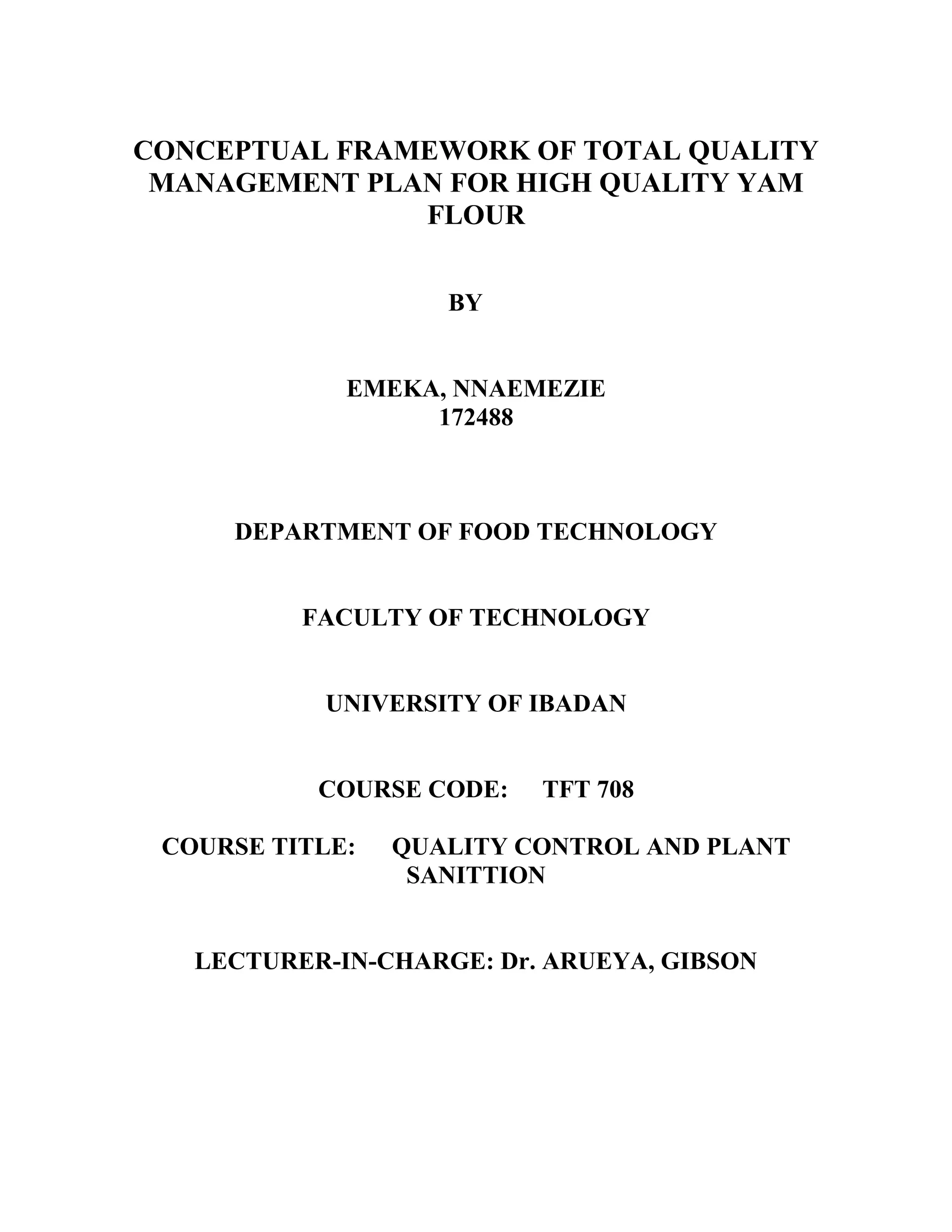 This document outlines a conceptual framework for a total quality management plan for producing high quality yam flour. It discusses key quality management concepts like customer-defined quality, cost of quality statements, and knowledge required for financial and production planning. It then provides details on the proposed production process, quality assurance and control measures, necessary equipment, and plant layout for instant yam flour manufacturing. The goal is to establish a quality management system to consistently deliver a high quality product that meets customer requirements.