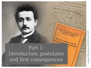 The document provides a conceptual introduction to special relativity, emphasizing that understanding the theory requires an open mind and a willingness to discard previous notions of space and time. It outlines the two foundational postulates: the constancy of the speed of light and the equivalence of all inertial reference frames, and discusses consequences such as the relativity of simultaneity and time dilation. Additionally, it illustrates through examples and thought experiments how these principles manifest in scenarios involving high-speed motion, ultimately challenging traditional perceptions of time and space.