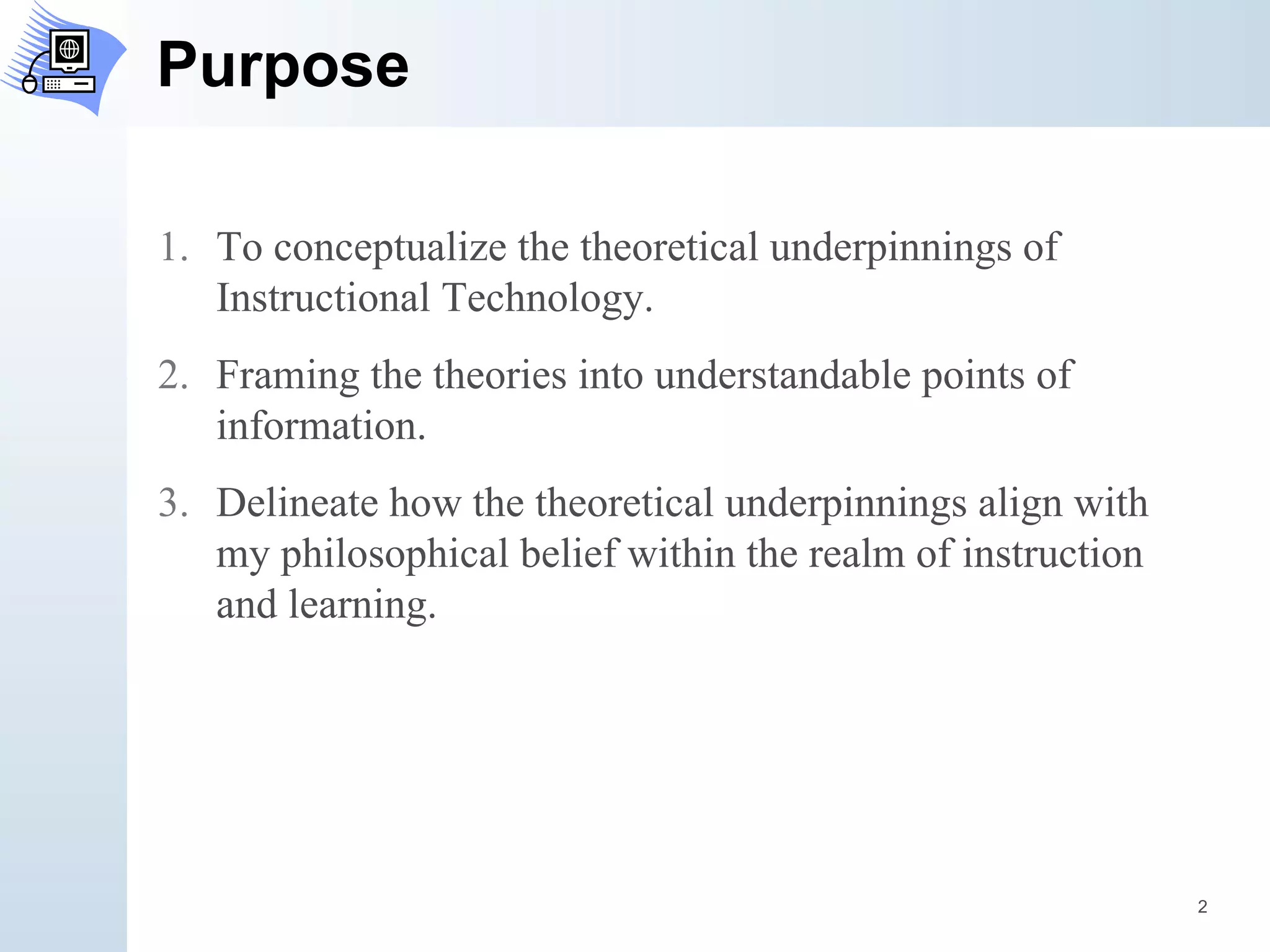 The document discusses various theories of instructional design and learning. It outlines several key psychological foundations of learning, including behavioral learning theory, cognitive information processing theory, schema theory and cognitive load theory, situated learning theory, and Gagne's theory of instruction. It then discusses how the theories align with the author's philosophical beliefs about learning, noting that constructivism best fits their view that learning occurs through relating new information to prior experiences and applying it in daily life.