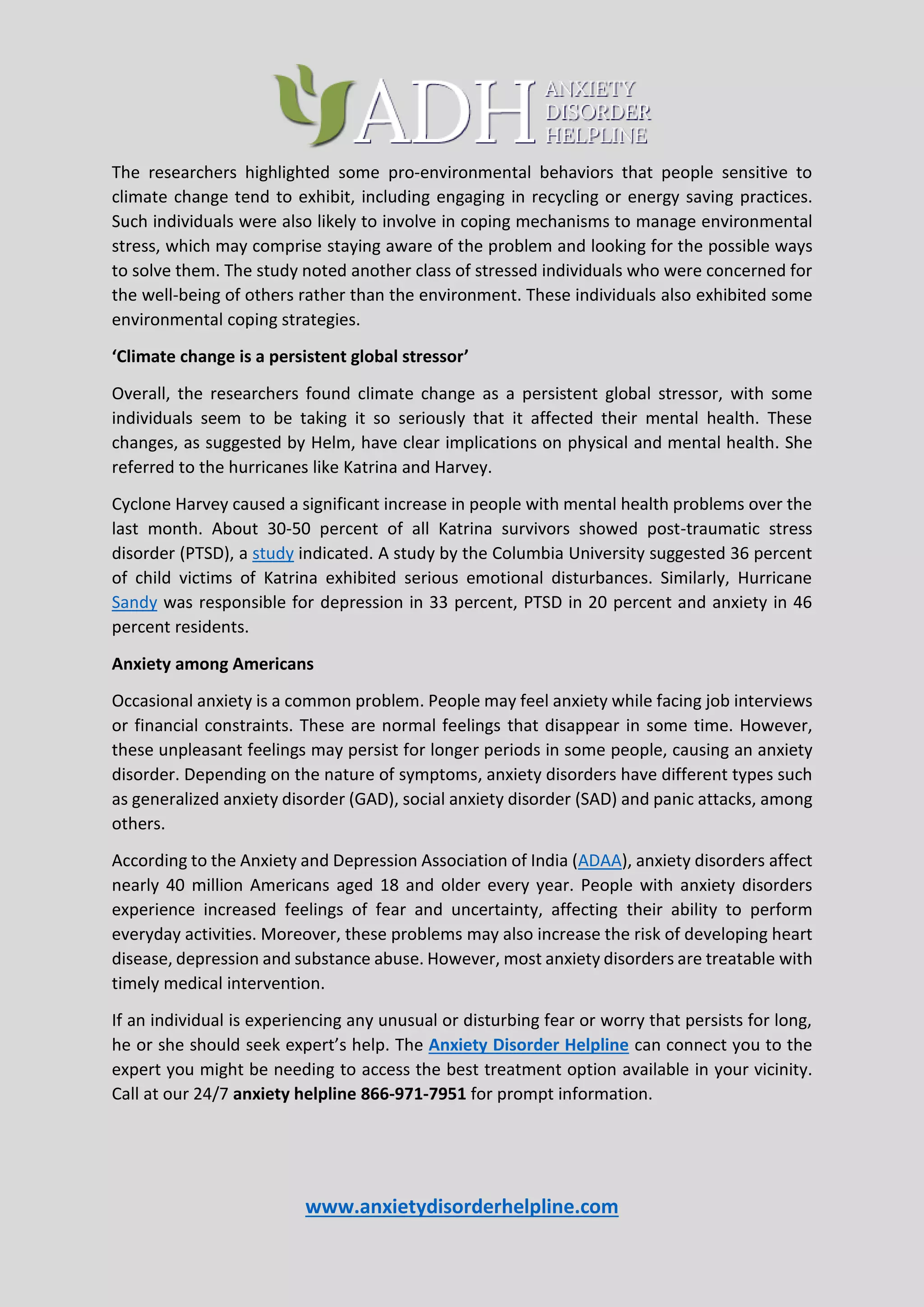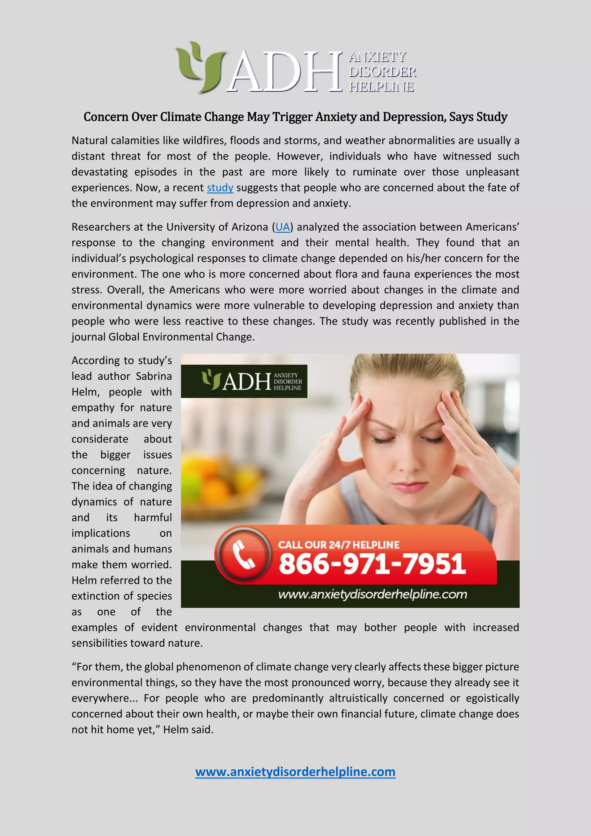 A recent study from the University of Arizona shows that increased concern about climate change can lead to heightened anxiety and depression, particularly among individuals with strong empathy for nature. Those affected by environmental changes are more likely to engage in pro-environmental behaviors and coping strategies, while climate change remains a significant global stressor linked to mental health issues. The document also discusses the prevalence of anxiety disorders in the U.S. and the importance of seeking help for persistent anxiety symptoms.