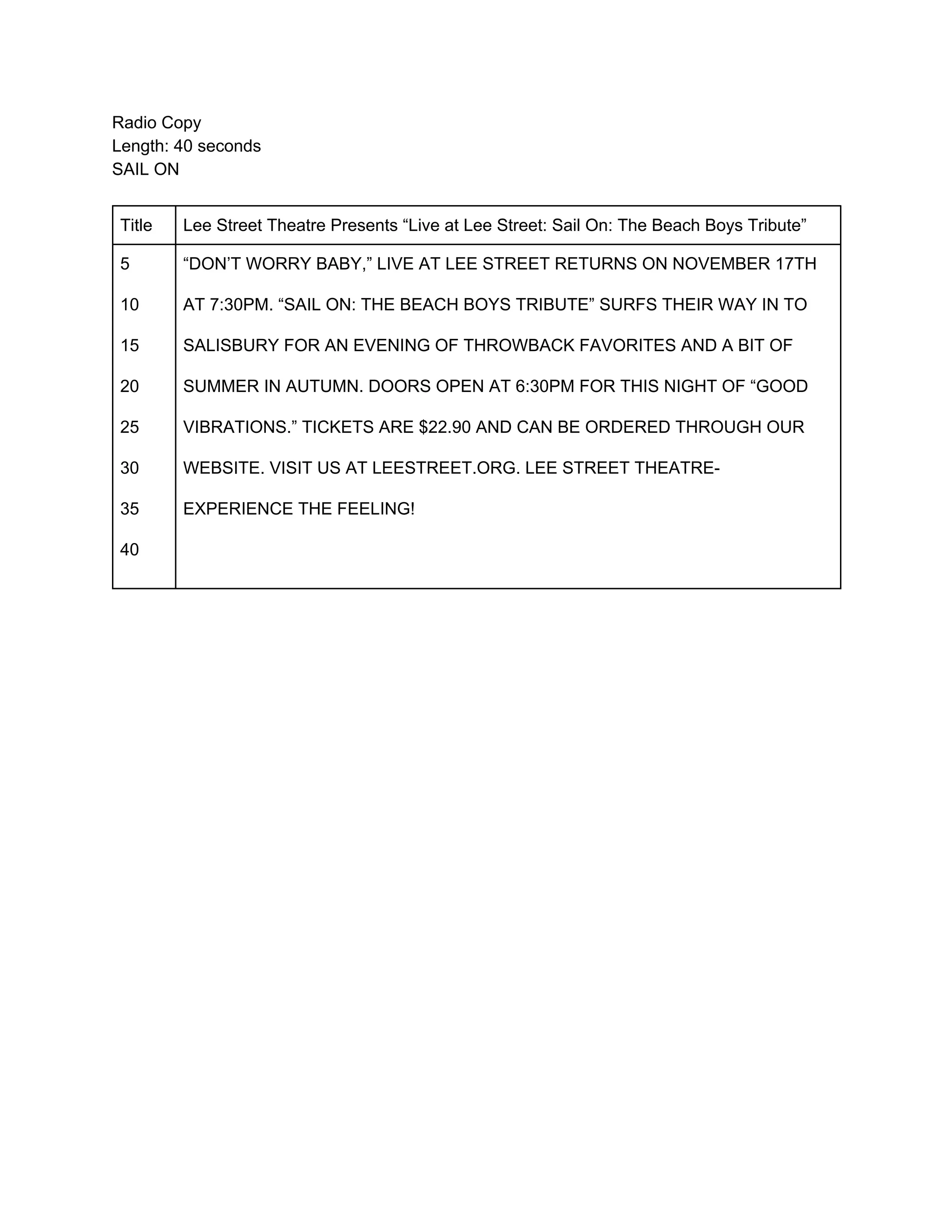 The Lee Street Theatre in Salisbury will present "Sail On: The Beach Boys Tribute" on November 17th at 7:30pm. This tribute band will perform classic Beach Boys hits to bring a taste of summer to the fall season. Tickets cost $22.90 and can be purchased online at leestreet.org.
