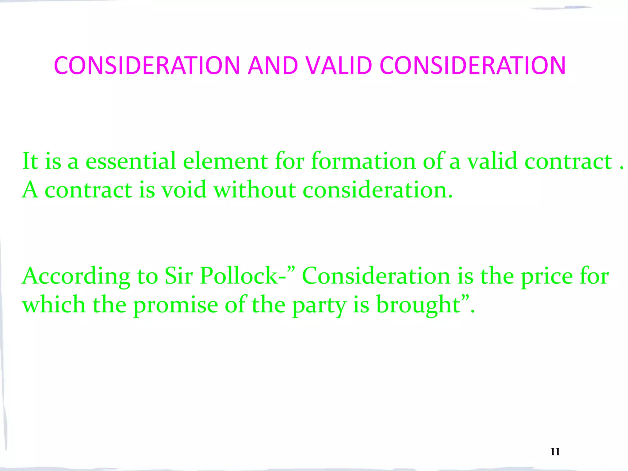 This document discusses the essential elements of consideration for forming a valid contract. It defines consideration as the price for which a party's promise is made. Consideration must be real and not illusory, move at the desire of the promisor, and be valuable in the eyes of the law. The document outlines different types of consideration including present, past, future, unlawful, and illusory consideration. It also discusses capacity and consent requirements for valid contracts.