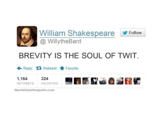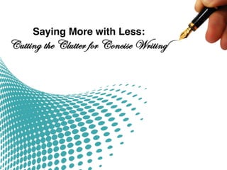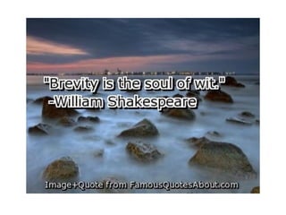 The document discusses the power of brevity in writing. It provides examples of concise phrases and sentences that effectively convey meaning using few words. It also examines why verbosity is common and provides tips for eliminating unnecessary words to improve clarity and readability.