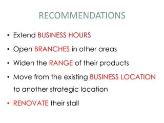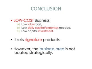 This document provides recommendations to improve a low-cost business by extending business hours, opening branches in other areas, widening the product range, moving to a more strategic location, and renovating their stall to take advantage of lower labor costs, capital needs, and signature products while addressing the non-strategic business area location.