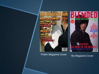 The document describes the development of a magazine cover the author created for a class project to familiarize themselves with Photoshop and Mac computers. The initial cover did not follow magazine conventions for layout and design. After learning about typical magazine formats, the author reworked the cover to include elements like placing the masthead at the top of the page and centering the cover image, model, and headline text. The revised contents page and inside pages also added typical magazine sections like an editor's letter, endorsements, and a subscription form.