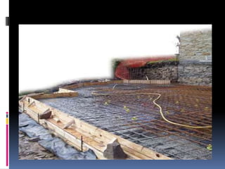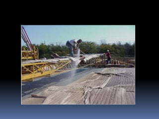 Concrete is a composite material made by mixing cement, water, and aggregates such as sand and gravel. The cement and water form a paste that binds the aggregates together. Concrete is very versatile and can be molded into any shape. It is one of the most widely used construction materials in the world due to its strength, durability, fire resistance and affordability. Proper curing of concrete by keeping it wet is important for it to gain full strength.