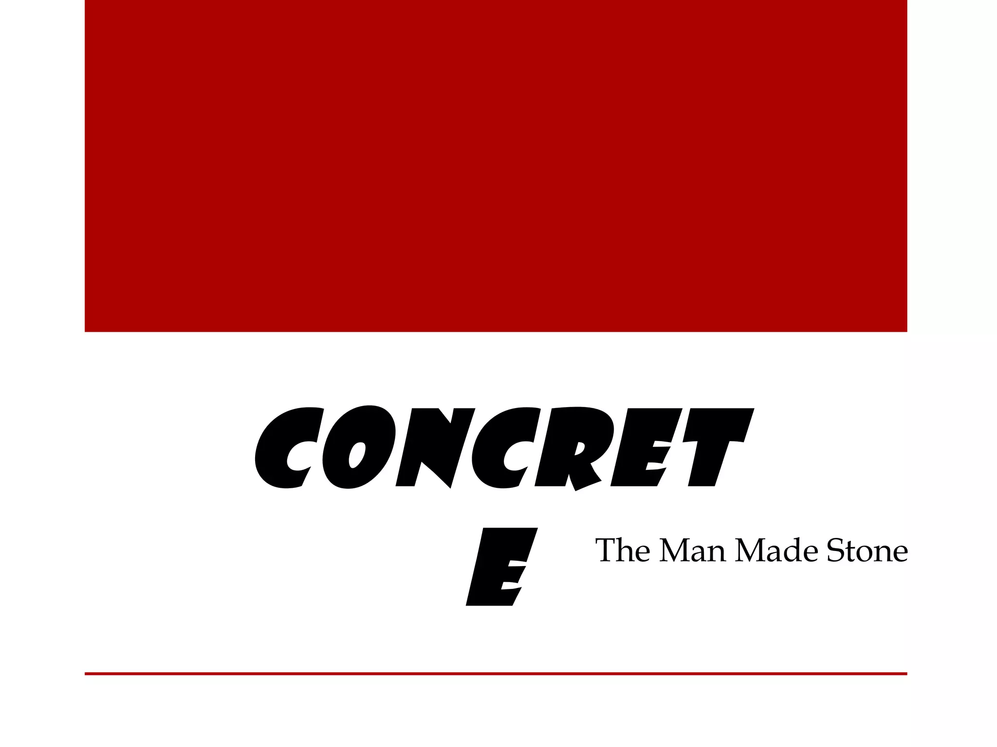 Concrete is a composite material made of water, aggregate, and cement. It has been used widely since Roman times. There are different types of concrete used for various purposes. The key constituents that give concrete its properties are cement, water, aggregates, and sometimes admixtures. Fresh concrete must have adequate workability and undergo proper curing to achieve maximum strength and durability over time. While concrete is economical and durable, it also has some disadvantages like low tensile strength requiring reinforcement.
