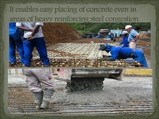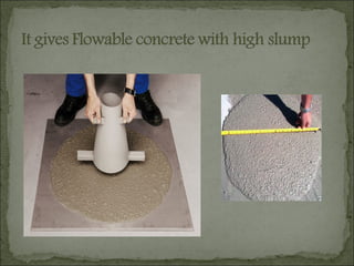 Admixtures are ingredients added to concrete other than cement, water and aggregates to achieve desired properties. Common admixtures include air-entraining, plasticizers, retarding, accelerating, corrosion inhibiting, waterproofing and grouting admixtures. Air-entraining admixtures introduce tiny air bubbles that allow space for ice expansion and prevent cracking. Plasticizers improve workability while using less water. Retarders slow hydration for placing large pours over time. Accelerators speed strength gain. Corrosion inhibitors protect reinforcement. Waterproofers make concrete less permeable. Mineral admixtures like fly ash and slag improve properties and provide environmental benefits.