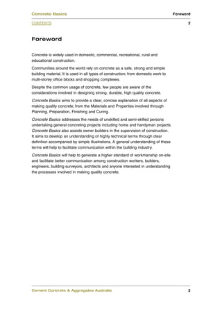 The document provides an overview of concrete basics, including the materials used to make concrete, properties of concrete in different states, common concrete tests to measure workability and strength, and factors that affect the strength and durability of hardened concrete. Concrete is made by mixing cement, water, coarse and fine aggregates, and sometimes admixtures, and its workability and strength can be tested using slump and compression tests.