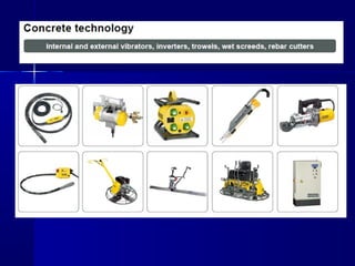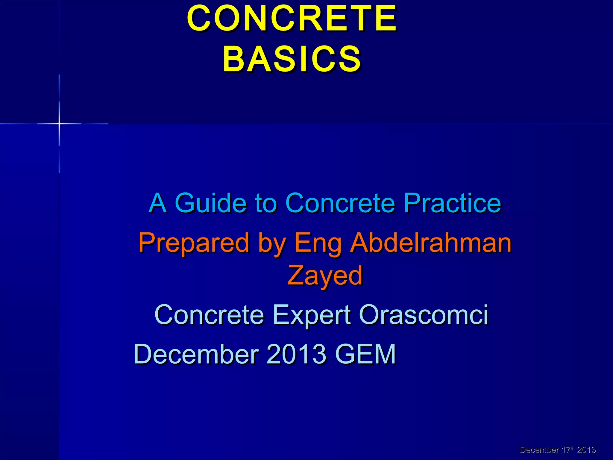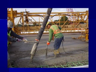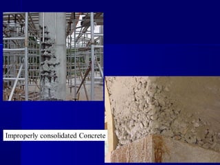 This document provides an overview of concrete basics including materials, properties, mixing, placing, and curing. It discusses the components of concrete including cement, water, aggregates, and admixtures. It describes the three states of concrete: plastic, setting, and hardening. It outlines best practices for mixing, placing, consolidating, and curing concrete to achieve optimum strength and durability. Inadequate consolidation can result in defects like honeycombing, sand streaks, or cold joints between batches.