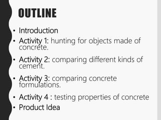 The document outlines a project focused on creating biodegradable concrete through a series of activities, including testing different formulations and properties of concrete. The project aims to develop an eco-friendly construction material to build temporary housing for workers, reducing costs and environmental impact. Recommendations for further studies are made to improve the biodegradable concrete and encourage wider application.