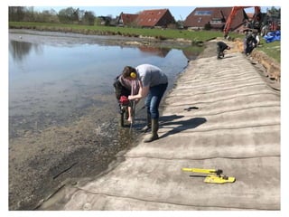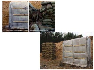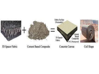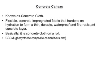 Concrete canvas, also known as concrete cloth, is a flexible, concrete-impregnated fabric that hardens upon hydration to create a durable and waterproof layer, eliminating the need for traditional concrete installation equipment. It is increasingly used for slope protection and channel lining due to its rapid installation capabilities and cost-effectiveness compared to non-structural shotcrete. The material is available in three thicknesses and has specific handling requirements to ensure optimal setting and strength.