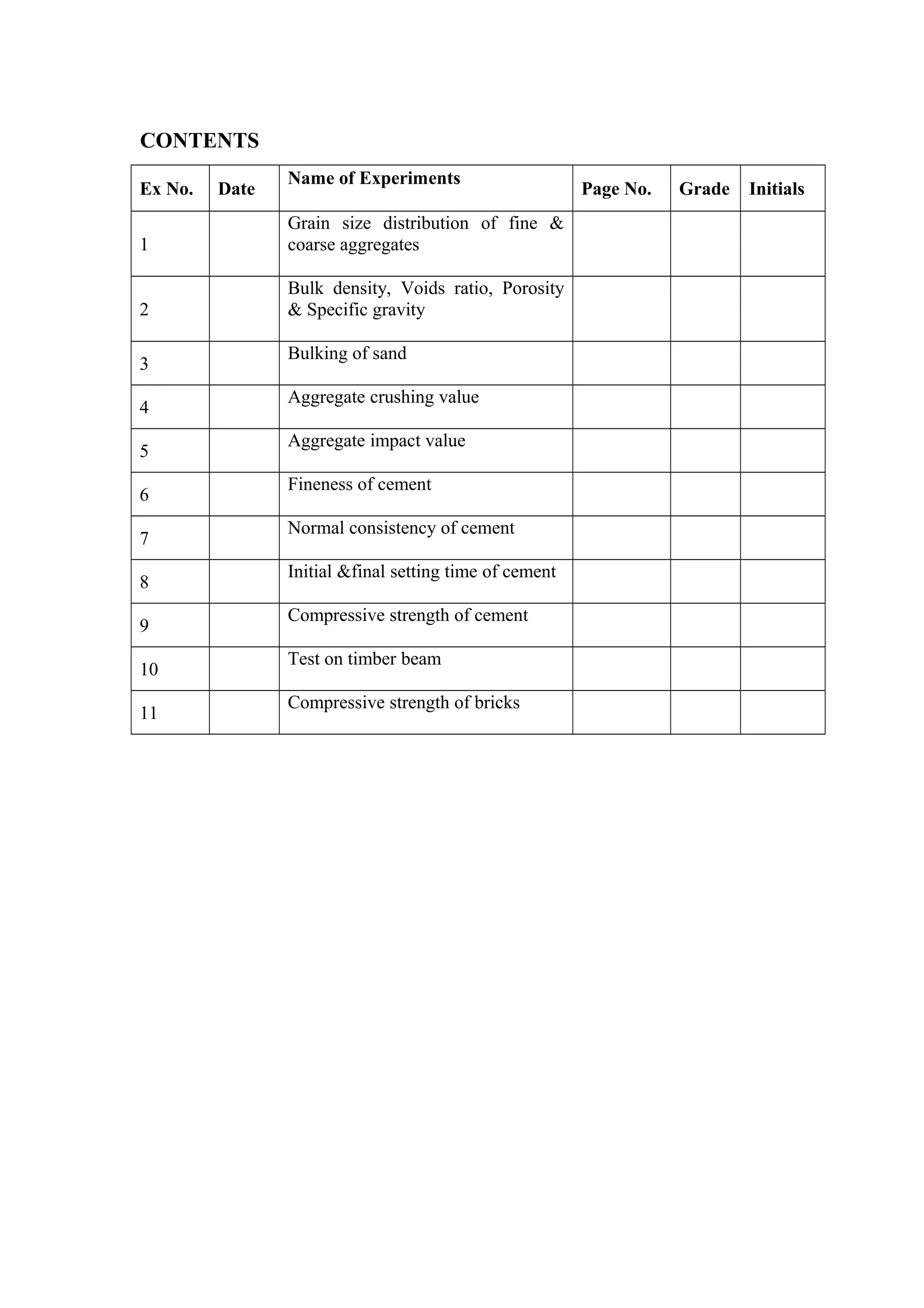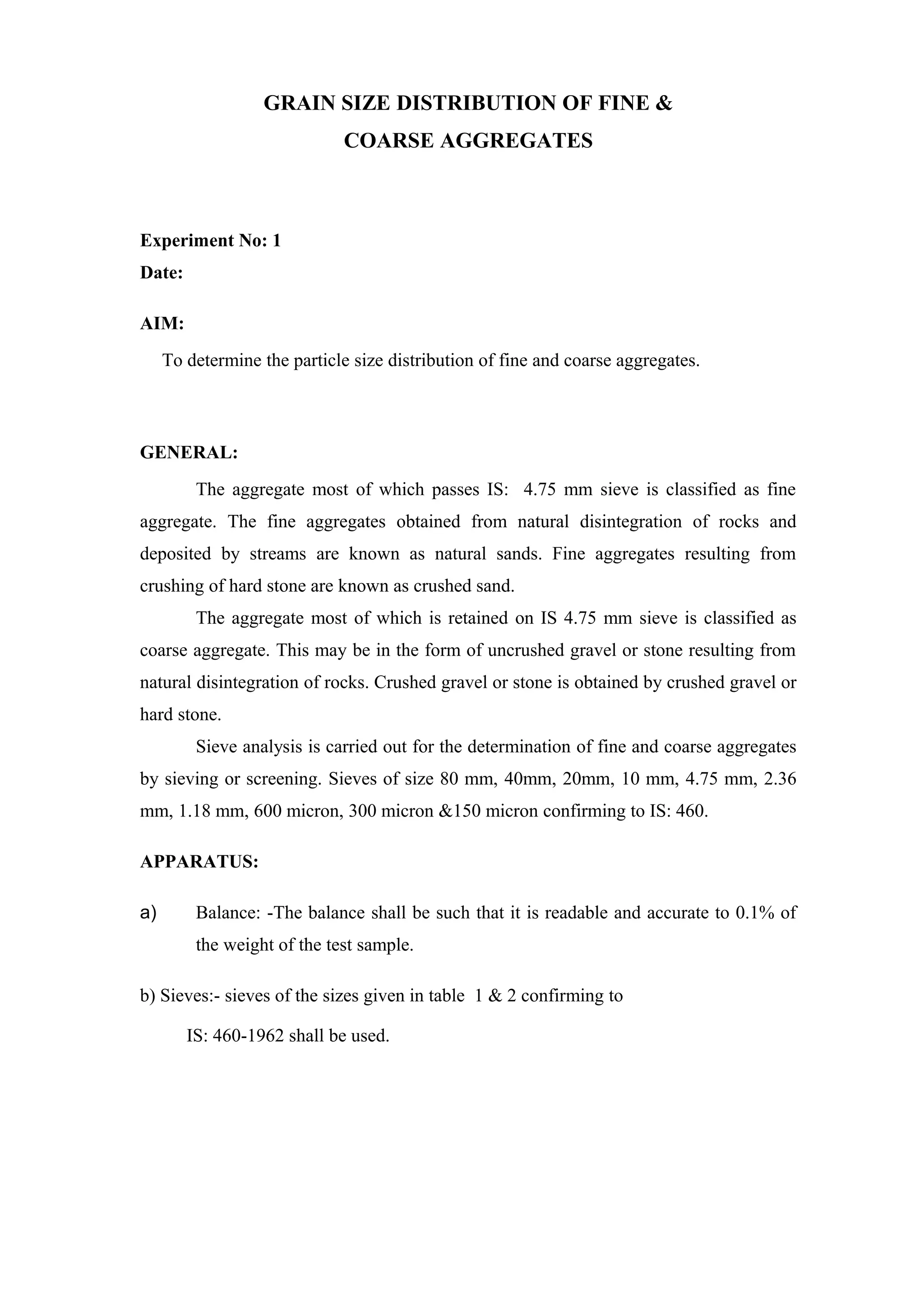 This document provides information on procedures to determine various properties of aggregates through laboratory experiments. It describes 12 experiments related to grain size distribution, bulk density, voids ratio, porosity, specific gravity, bulking, crushing value, impact value, and compressive strength of aggregates and cement. The summary focuses on Experiment 1 which involves determining the particle size distribution of fine and coarse aggregates through sieve analysis.