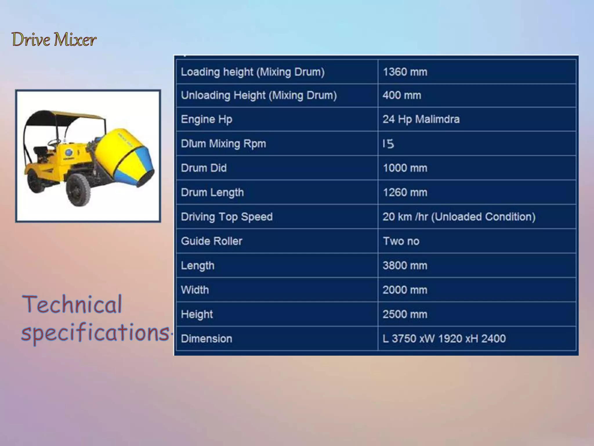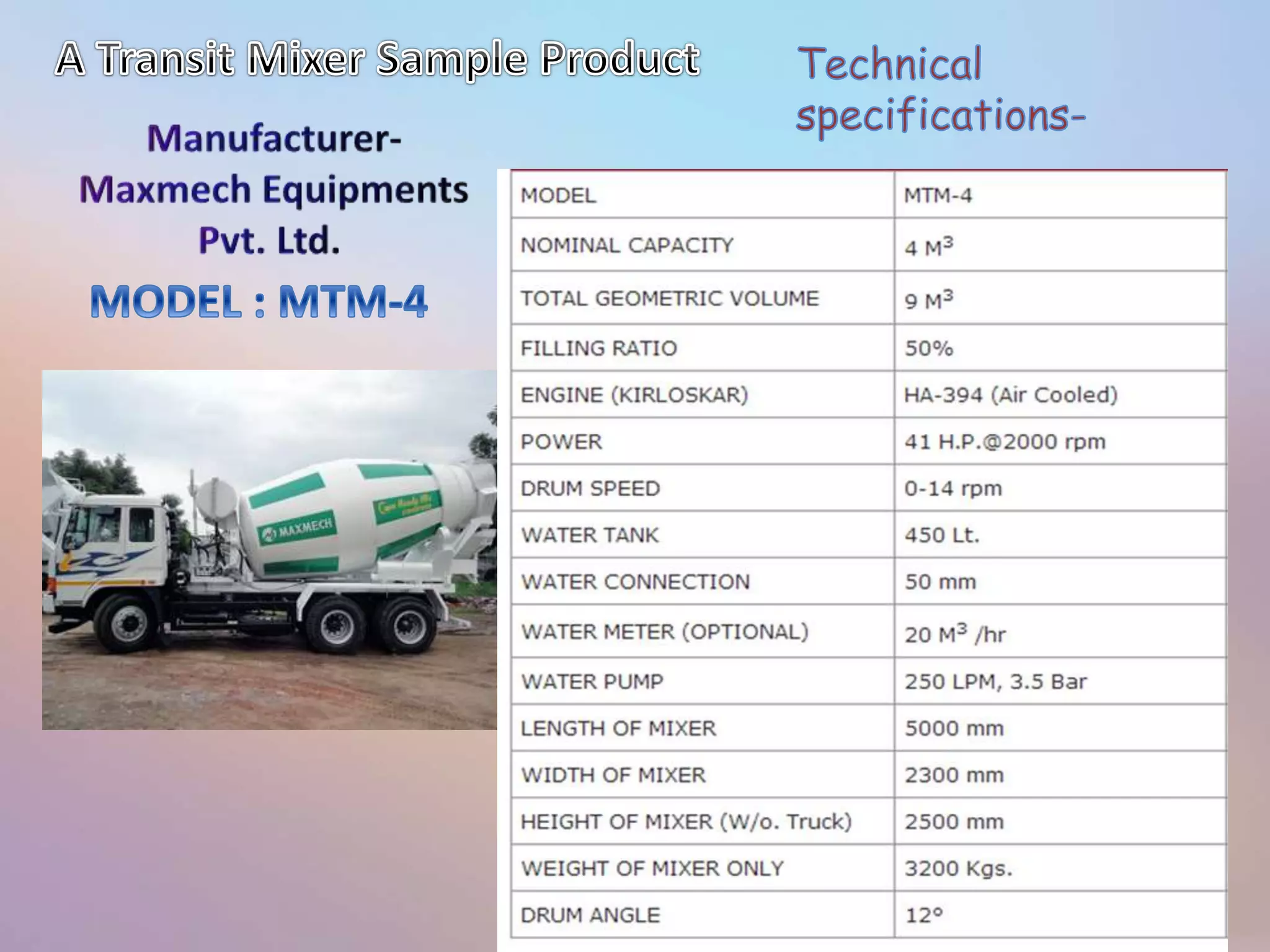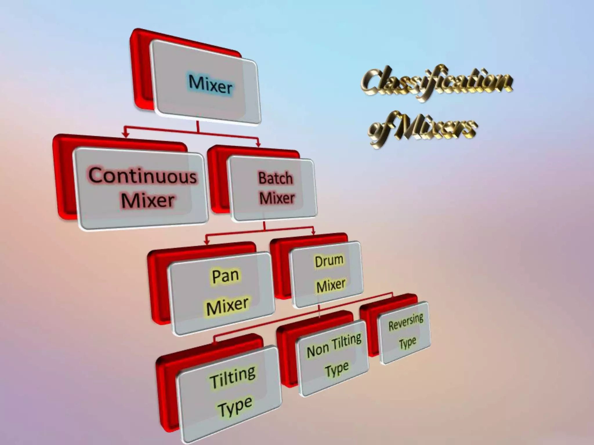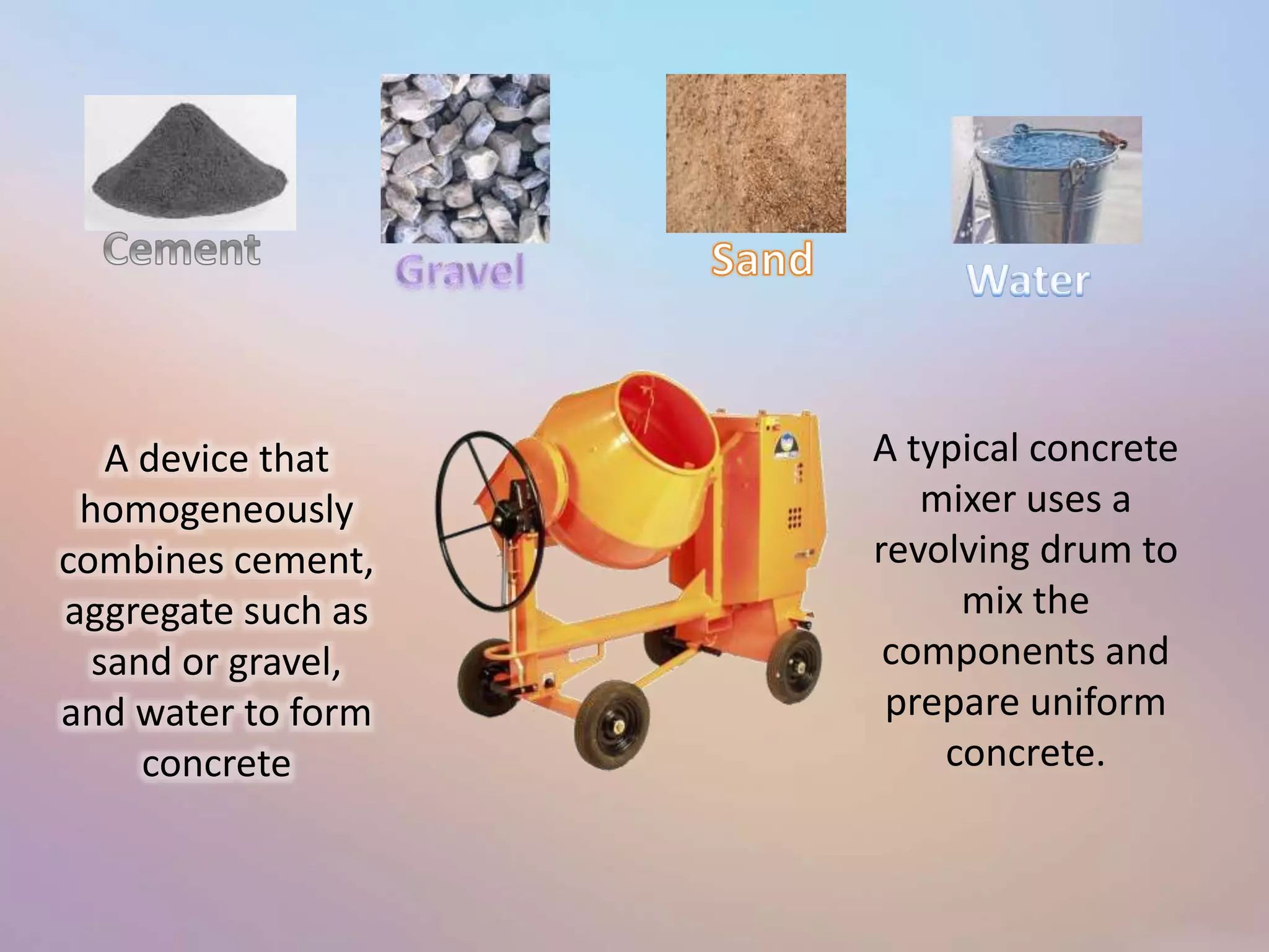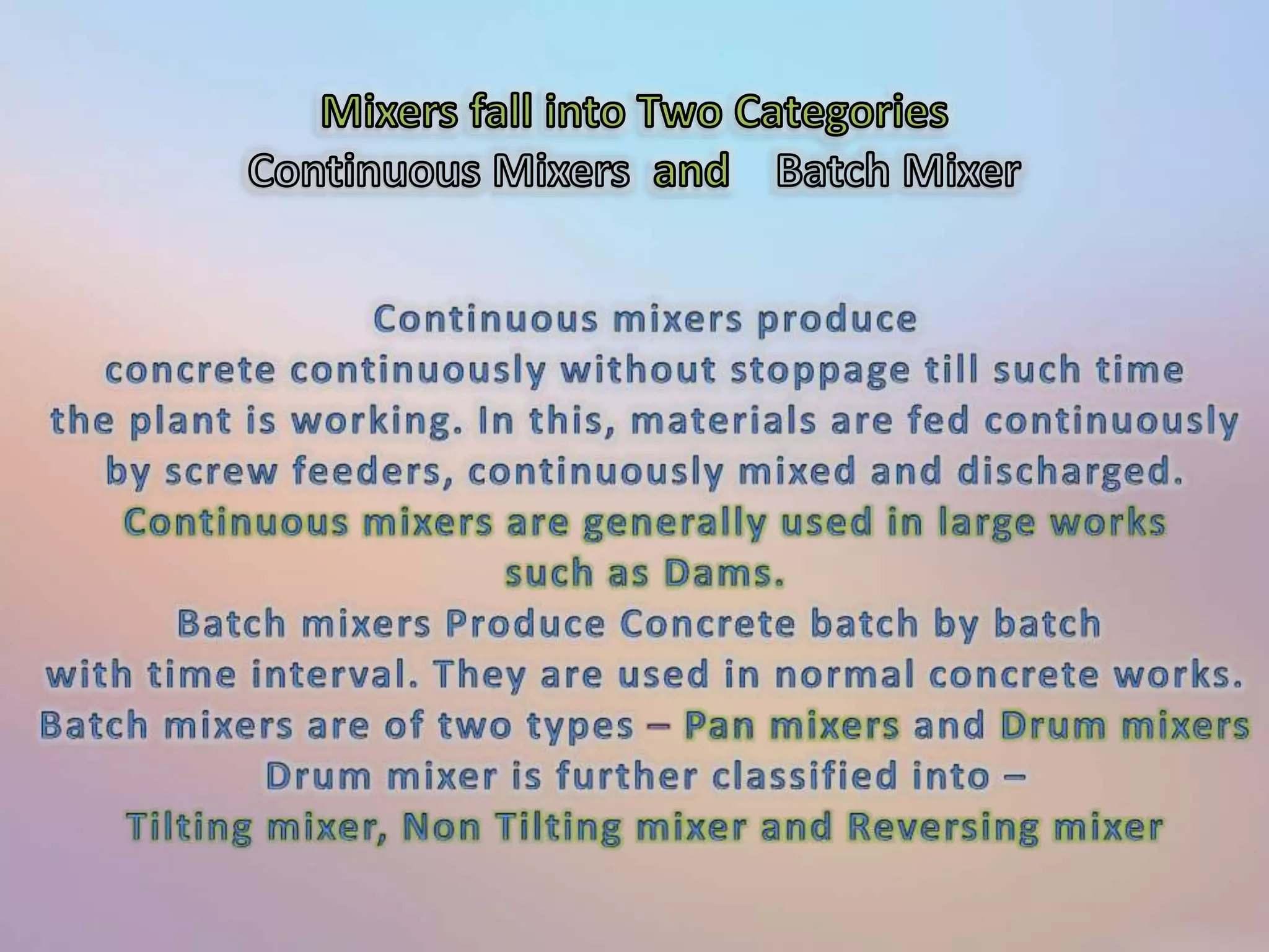 The document describes different types of concrete mixers, including non-tilting, tilting, and reversing mixers, highlighting their designs and suitable applications based on concrete types. It also provides specifications for various mixer models, including capacity and output. Additionally, it explains the function of transit mixers, which transport and mix concrete, maintaining its liquid state during delivery.