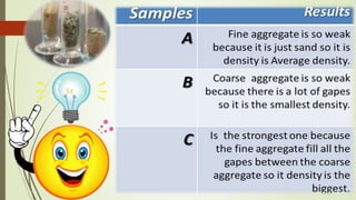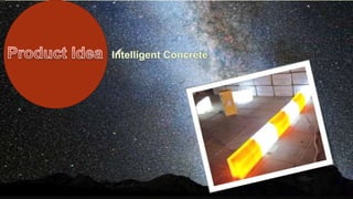 The document outlines a series of activities aimed at exploring the properties and applications of concrete, including hardness comparisons and density tests of mixed aggregates. It introduces a product idea for intelligent concrete that incorporates materials which can change color in response to temperature, enhancing safety in urban settings. The activities and findings are intended to address issues such as visibility and weather conditions affecting drivers on roadways.