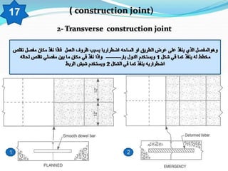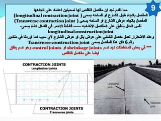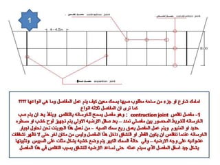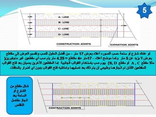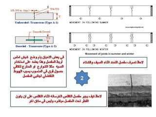 تتناول الوثيقة مفاصل التمدد في pavements الخرسانية والتي تسمح للخرسانة بالتمدد بسبب التغيرات الحرارية. يتم تصنيع المفاصل باستخدام مواد خاصة وتطبيقها في أماكن محددة لضمان الأداء السليم للخرسانة. يُفضل تنفيذ هذه المفاصل كل 30-40 مترًا حسب الظروف البيئية.