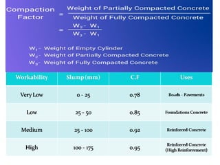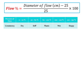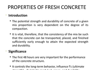 The document discusses the properties of fresh concrete and standard tests to evaluate its characteristics, such as workability, consistency, and setting time. It emphasizes the importance of compaction, the effects of water content, and various tests like the slump and flow tests to assess concrete quality. Additionally, it outlines factors affecting workability, segregation, and bleeding in concrete, along with methods for curing and managing concrete in different weather conditions.