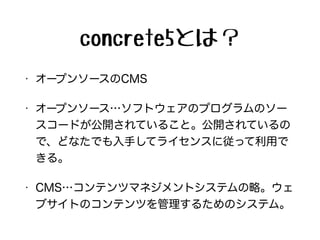 オープンソースCMS「concrete5」でウェブサイトを作ってみよう!初心者対象のチュートリアルガイドです。用意するものはブラウザのみ。HTML/CSS/PHPの知識は一切不要。勉強会などで使用してください。