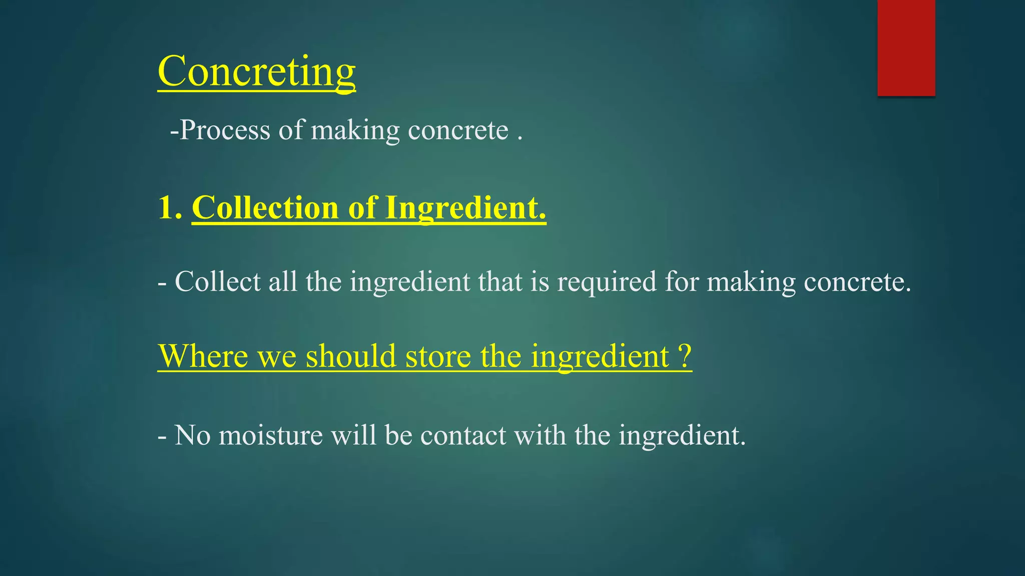 The document outlines the 8 key steps in the concreting process: 1) Collection of ingredients, 2) Batching ingredients by volume or weight, 3) Mixing ingredients homogeneously, 4) Transporting concrete via pans, wheelbarrows, trucks or conveyors, 5) Placing concrete in formworks, 6) Compacting concrete using tamping rods or vibrators, 7) Finishing concrete through screeding or troweling, and 8) Curing concrete through water sprinkling, ponding, steaming or covering to improve durability and reduce shrinkage.