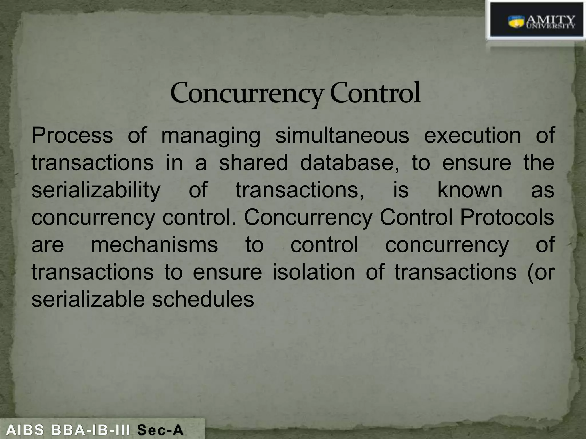 Concurrency control is a mechanism for managing simultaneous transactions in a shared database to ensure serializability and isolation of transactions. It utilizes locking protocols like two-phase locking to control access to database items during transactions and prevent issues like lost updates, dirty reads, and incorrect summaries that can occur without concurrency control when transactions' operations are interleaved.
