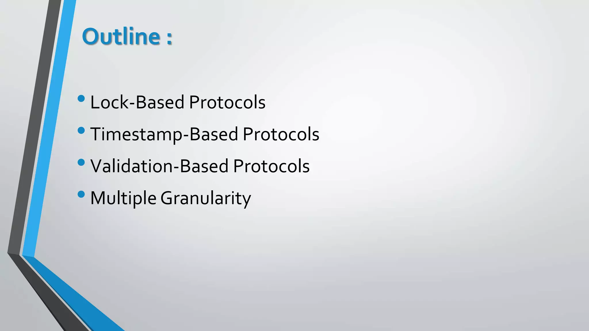 This document outlines different concurrency control protocols used to ensure serializability of transactions in a database. It discusses lock-based protocols like two-phase locking and tree protocols. It also covers timestamp-based protocols that assign timestamps to transactions and validate reads/writes based on timestamp order. Validation-based protocols execute transactions optimistically and validate during a separate validation phase if updates can be committed without violating serializability.